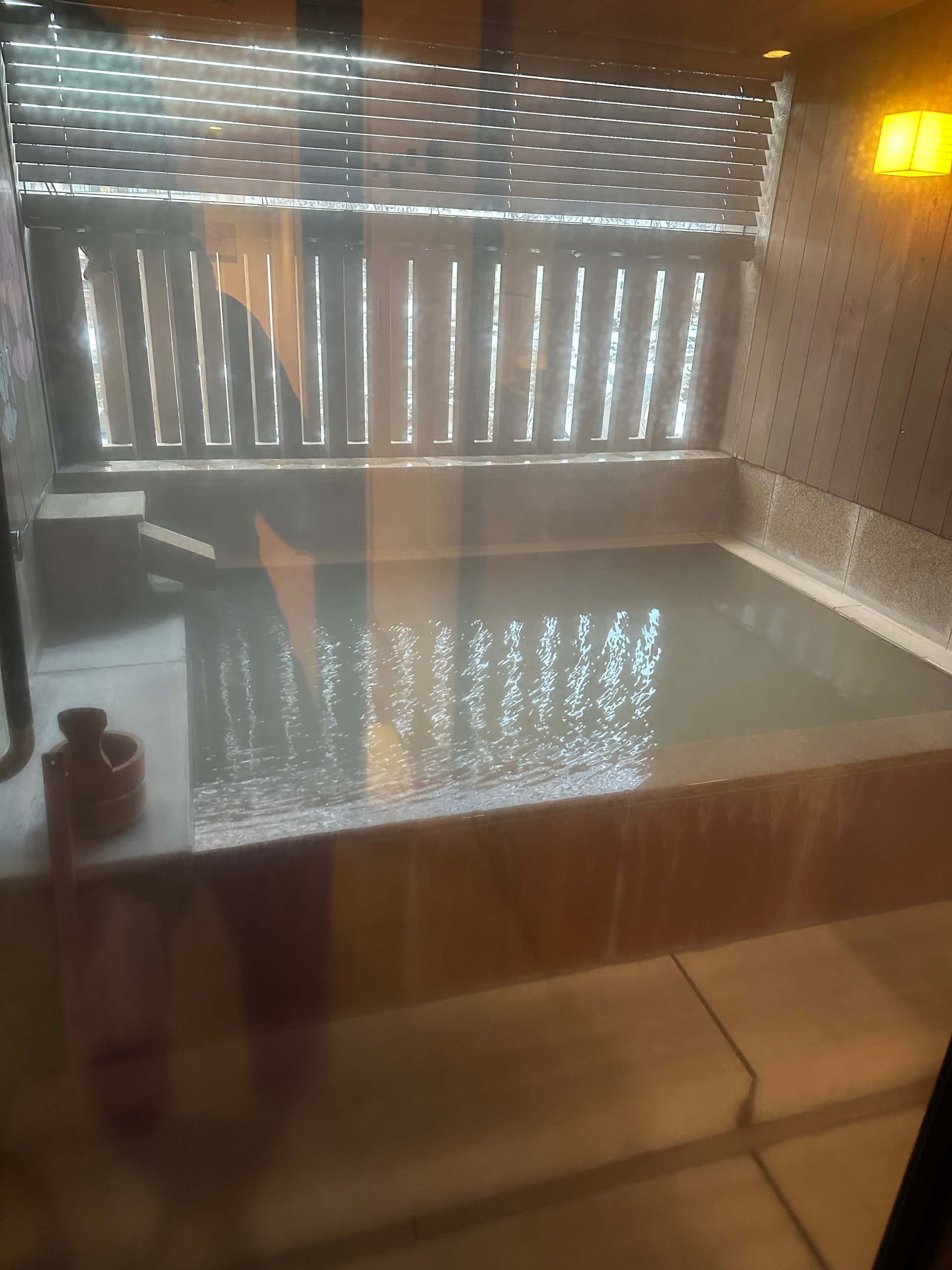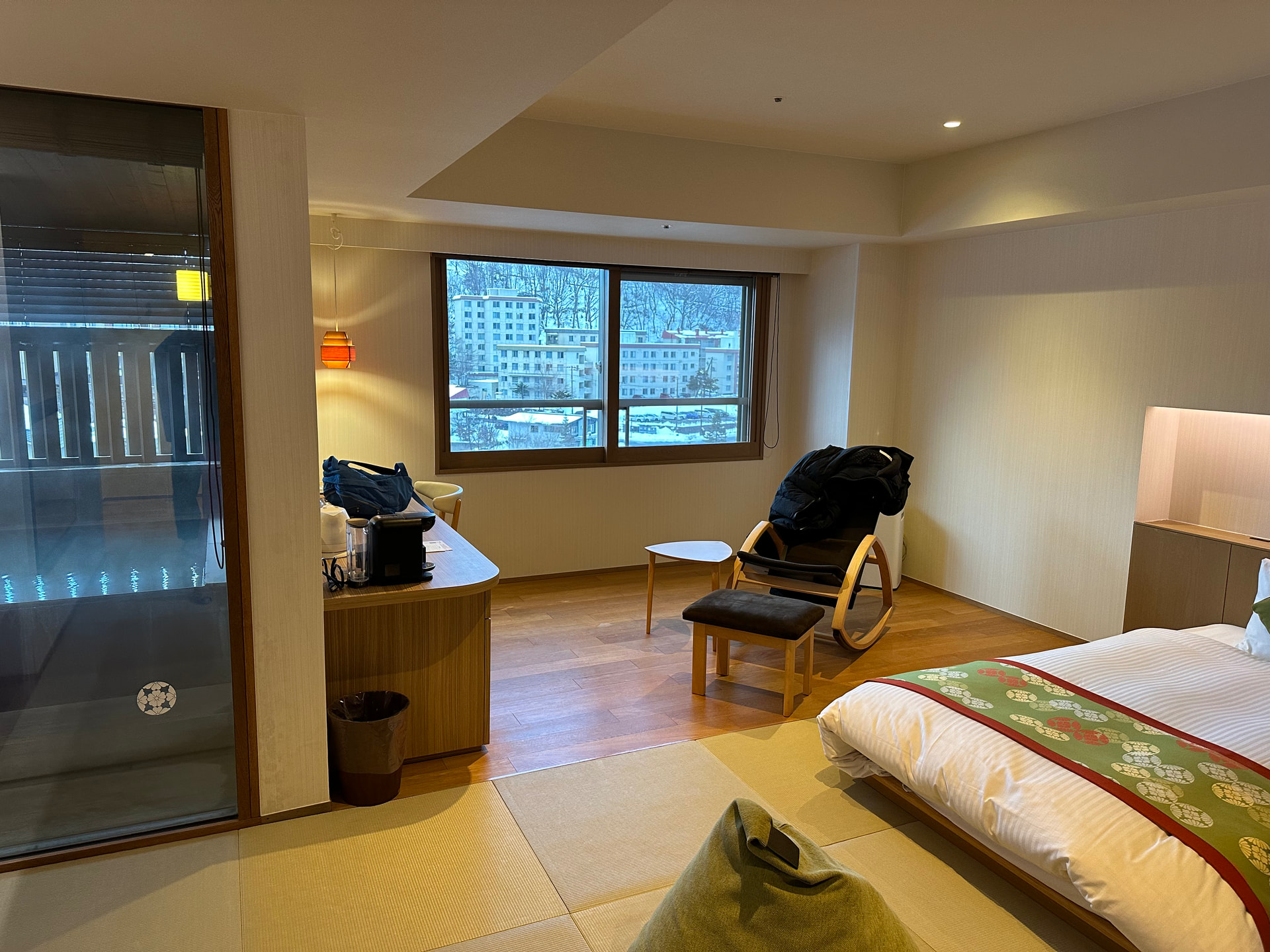 房间非常大,两张单人床,有洗手池和放浴袍和其他小东西的衣帽间。淋浴房外是私汤。对于不想去public的人来说私汤确实舒服多了,而且登别的温泉对比洞爷硫磺味道还蛮明显的。