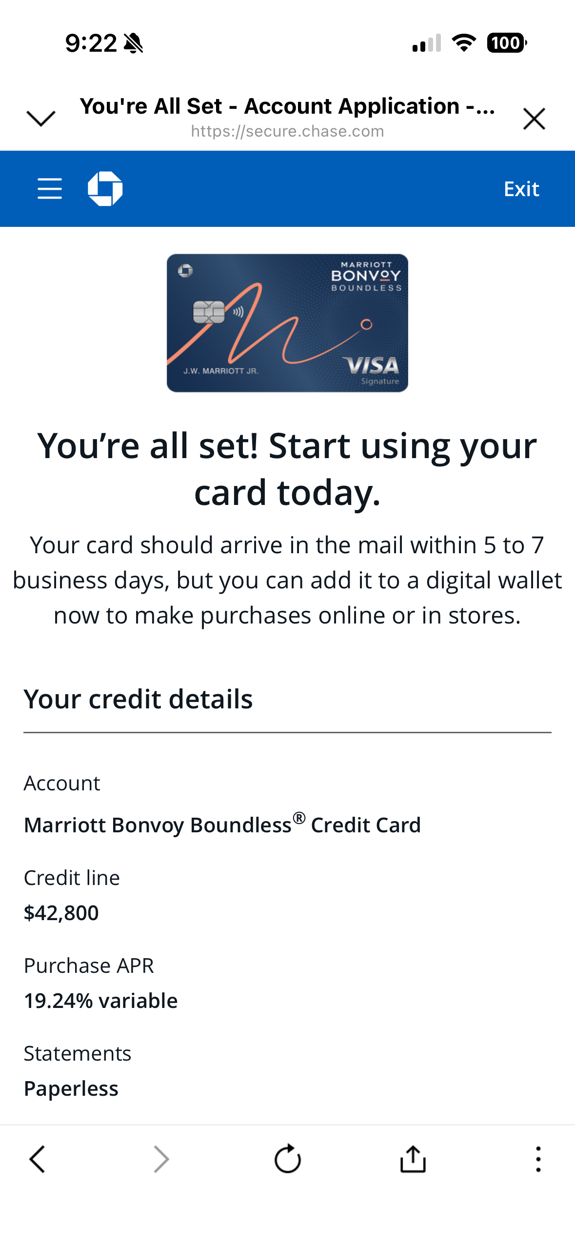 祝贺,厉害。你是说,开了这张Marriot Boundless, 你现在手上有7张 chase 信用卡? 是吗
