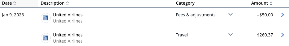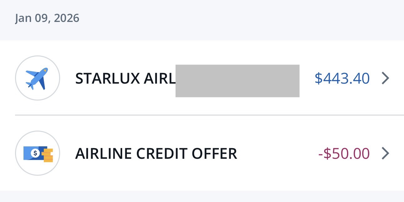 A $50 statement credit will be automatically applied to your account when you spend $250 or more on eligible purchases made directly with airlines from January 1 through June 30, 2026. A second $50 statement credit will be automatically applied to your account when you spend another $250 or more on eligible purchases made directly with airlines from July 1 through December 31, 2026, for a total maximum accumulation of $100 in statement credits through 12/31/2026.