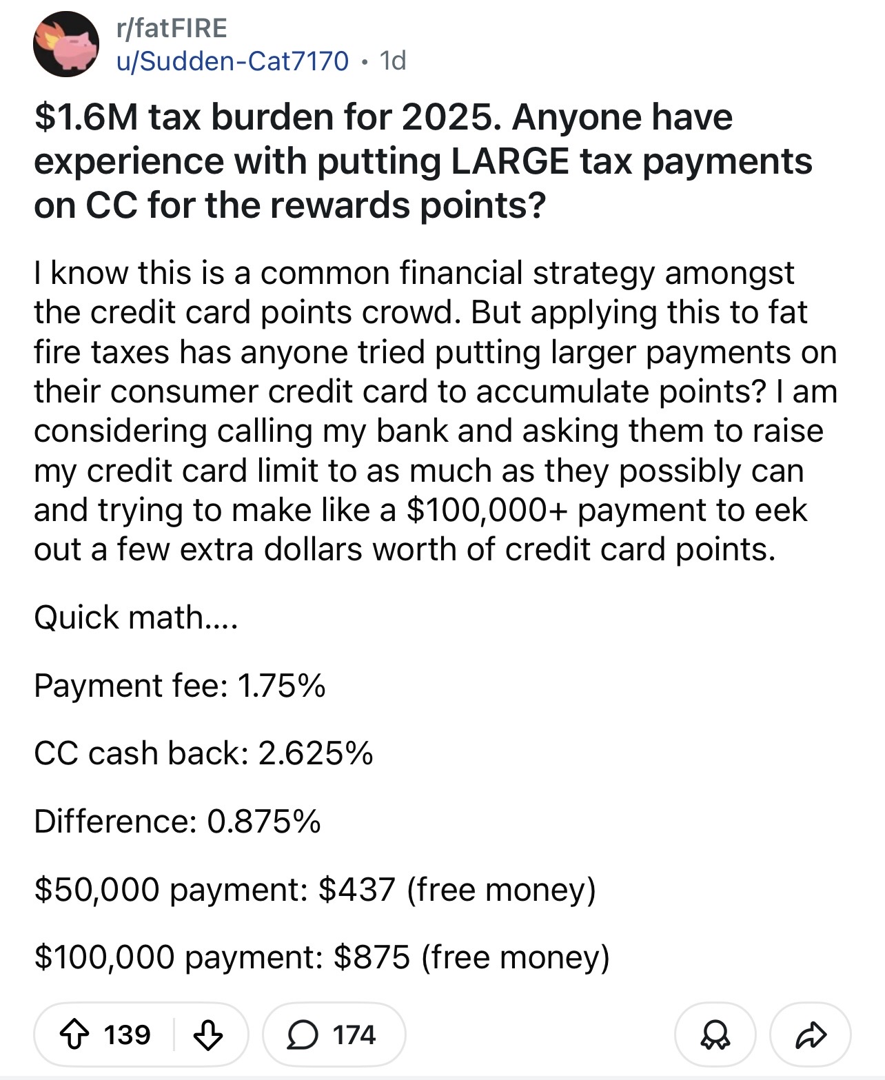 楼主可以尝试找BoA提下额度,BoA我觉得对于信用历史长并且有premium rewards status的人还挺慷慨的,我上次PRElite是$37.5k → $75k提额(提交后过了一两天人工批的),后来把Elite关的时候额度都挪给PR卡了。这种大额消费还是得靠BoA或者C1才能有大额度。Debit的都限额很低,然后PayPal 3% MasterCard理论上交税很好,实际额度很难超过$10k。
