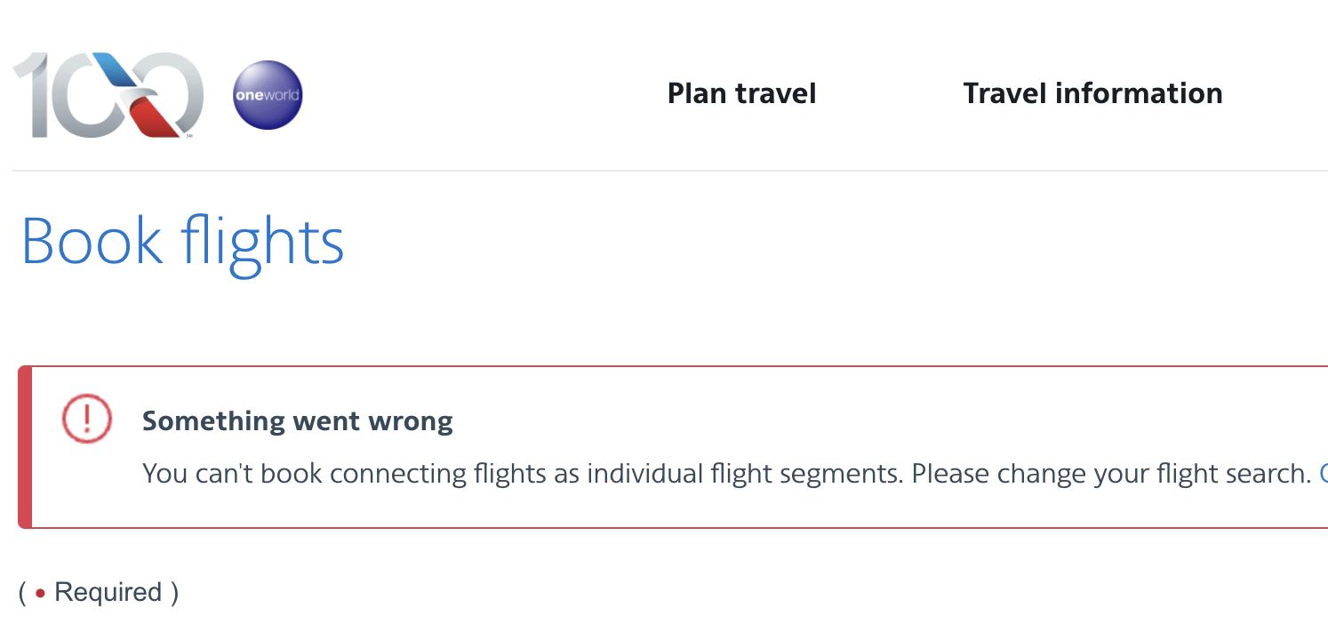 直接从AA 搜 美国-欧洲的话最长LHR的转机时间只有11h,有点尴尬 (第一天7pm到第二天6am出发)。于是我用multi city 搜 把转机时间拉长到18h,票搜出来价格不变但等到check out的时候就报错,如图