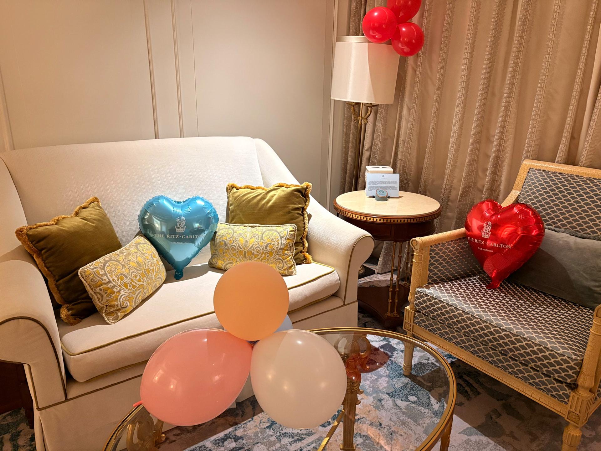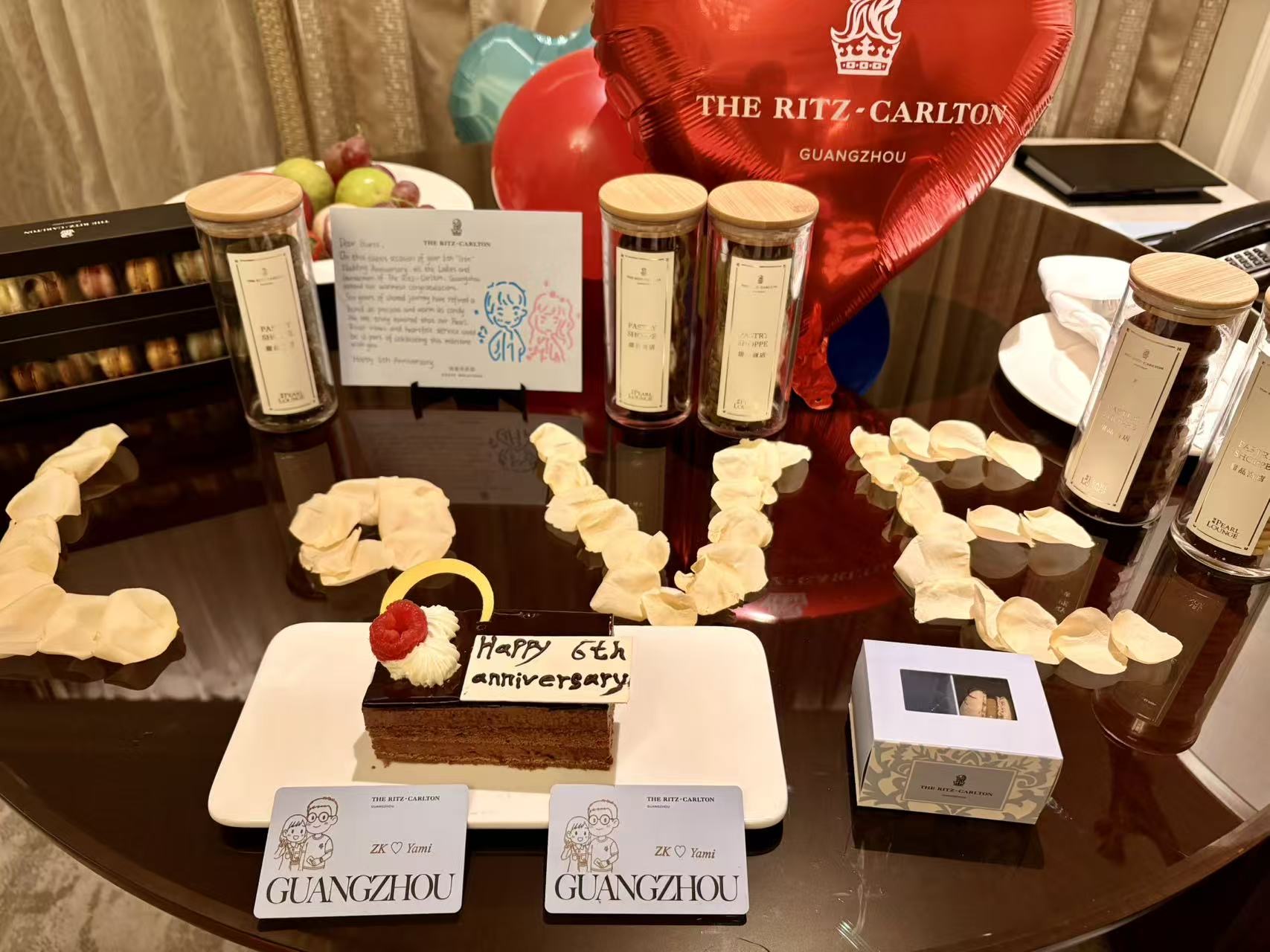 有蛋糕,手写贺卡,房间内好多气球,花瓣摆的love。很不错的是可以定制房卡,入住前打电话给前台加客户关系经理微信发定制图案。总体来说是很用心啦。图片里的曲奇和马卡龙不是送的,是用FHR 100刀credit在大堂吧买的。![]()