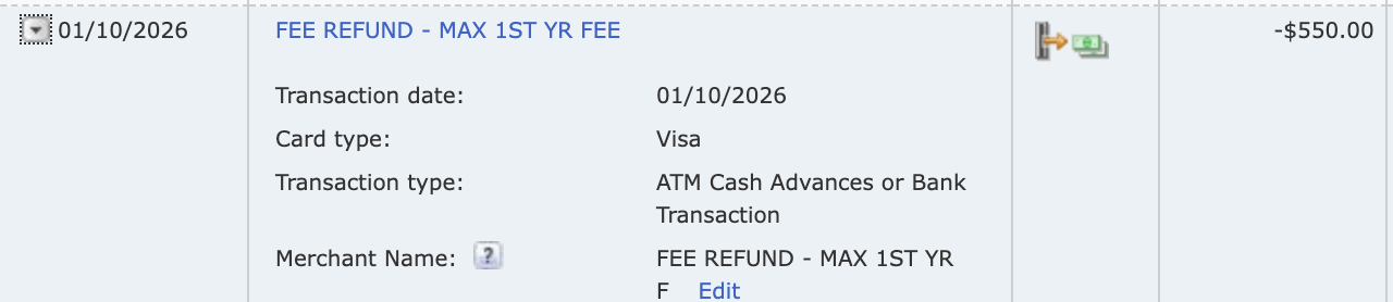 今天发现 boa 给了 $550 membership fee refund, transaction description: [FEE REFUND - MAX 1ST YR FEE]