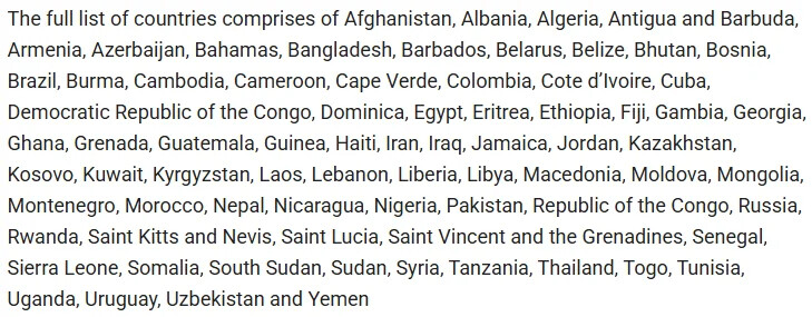 The full list of countries comprises of Afghanistan, Albania, Algeria, Antigua and Barbuda, Armenia, Azerbaijan, Bahamas, Bangladesh, Barbados, Belarus, Belize, Bhutan, Bosnia, Brazil, Burma, Cambodia, Cameroon, Cape Verde, Colombia, Cote d’Ivoire, Cuba, Democratic Republic of the Congo, Dominica, Egypt, Eritrea, Ethiopia, Fiji, Gambia, Georgia, Ghana, Grenada, Guatemala, Guinea, Haiti, Iran, Iraq, Jamaica, Jordan, Kazakhstan, Kosovo, Kuwait, Kyrgyzstan, Laos, Lebanon, Liberia, Libya, Macedonia, Moldova, Mongolia, Montenegro, Morocco, Nepal, Nicaragua, Nigeria, Pakistan, Republic of the Congo, Russia, Rwanda, Saint Kitts and Nevis, Saint Lucia, Saint Vincent and the Grenadines, Senegal, Sierra Leone, Somalia, South Sudan, Sudan, Syria, Tanzania, Thailand, Togo, Tunisia, Uganda, Uruguay, Uzbekistan and Yemen