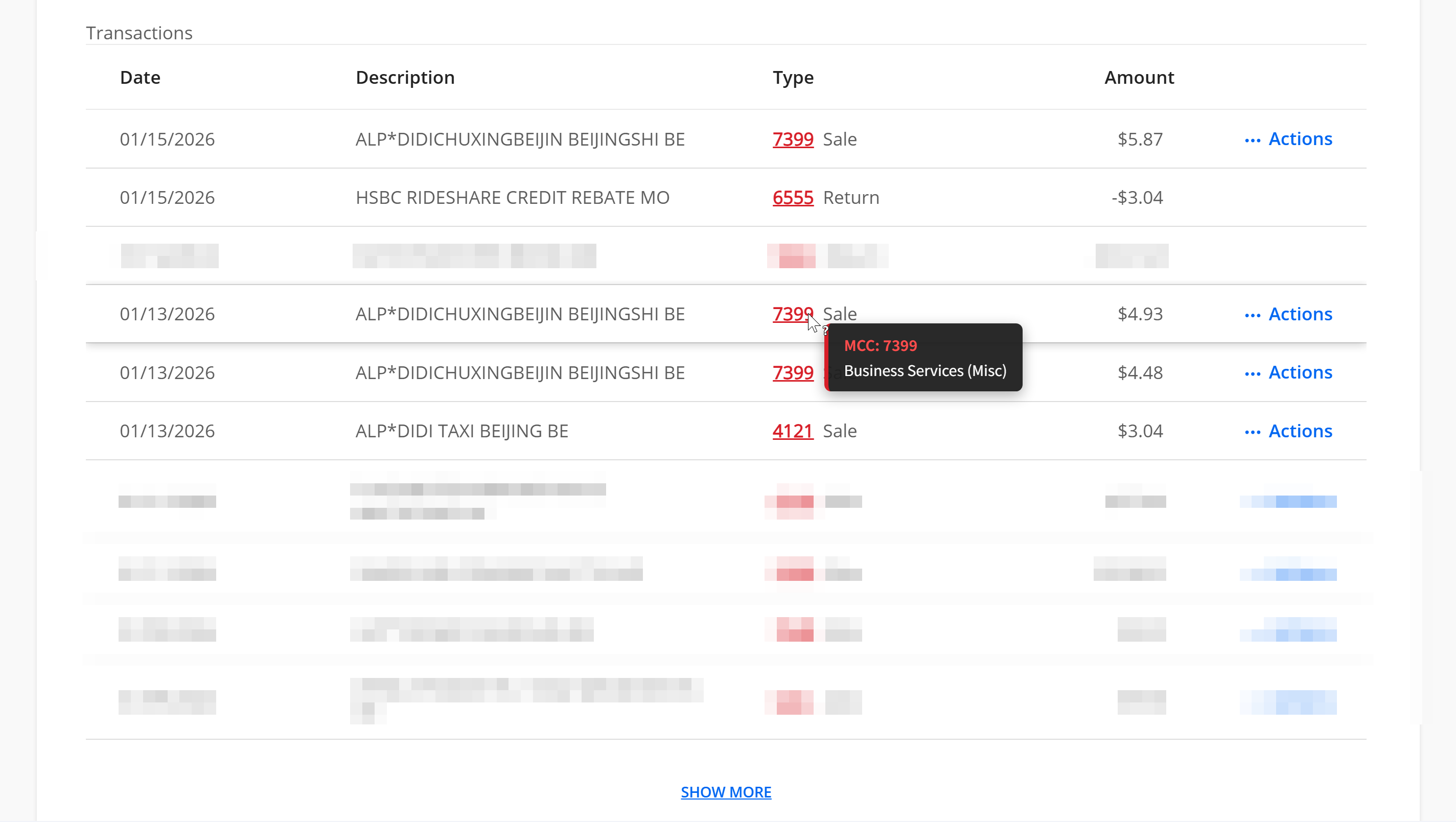 适用于网银 dashboard 以及跳转到的 firstdata 页面:F12 找到 “transaction” 什么的 XHR 请求,可以看到返回的信息种包含 MCC(处于 pending 的交易不包含 MCC )