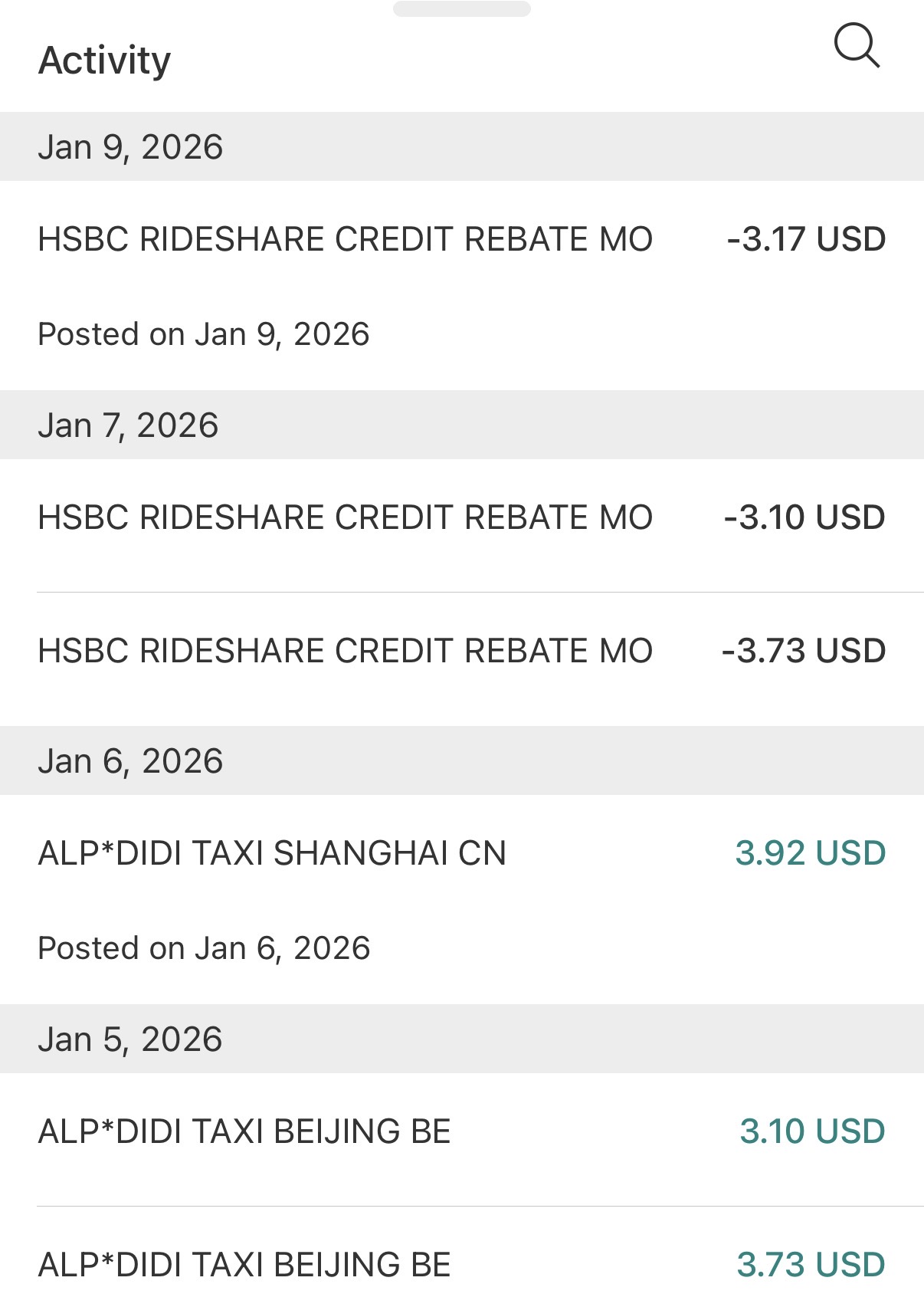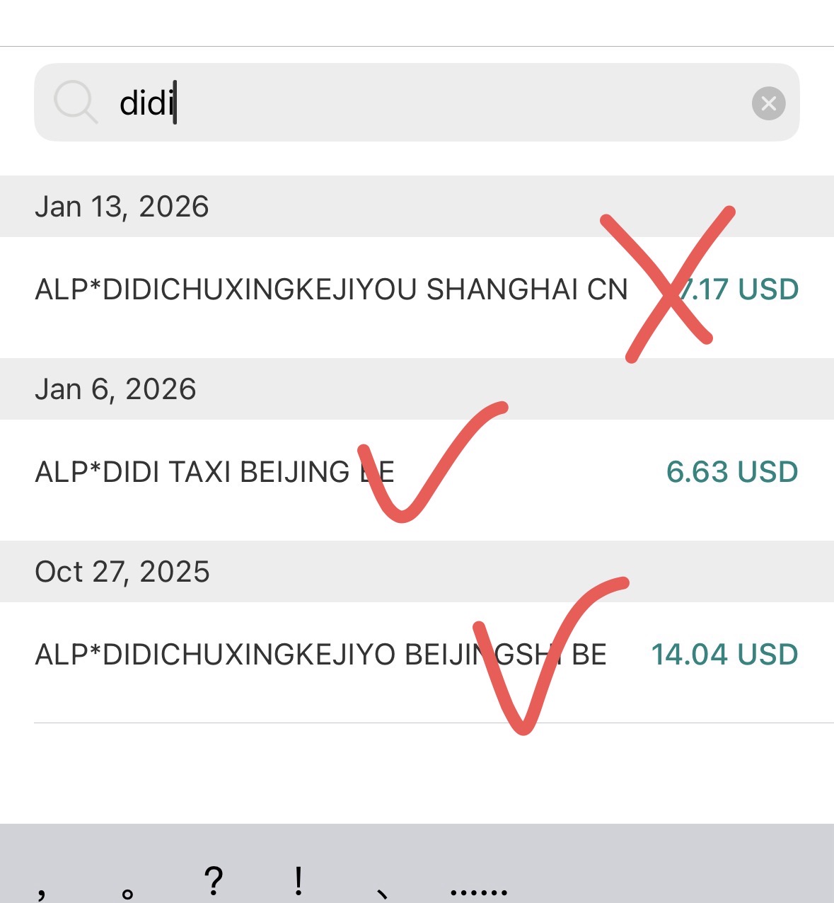 | 20260116 | ALP*DIDICHUXINGBEIJING SHANGHAI CN | 7399 | 滴滴-支付宝 | N | ||