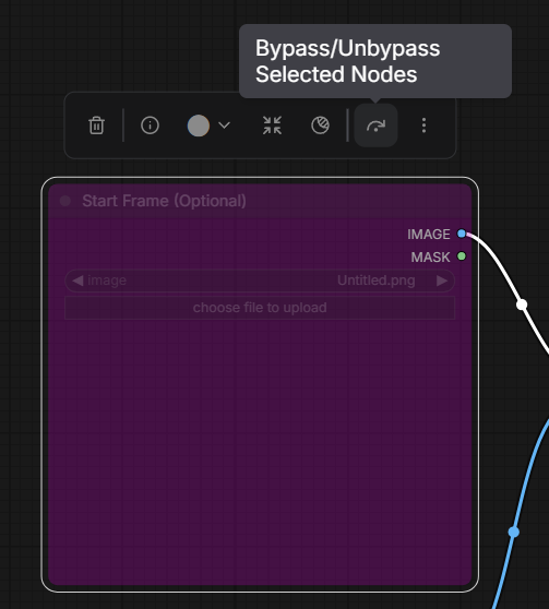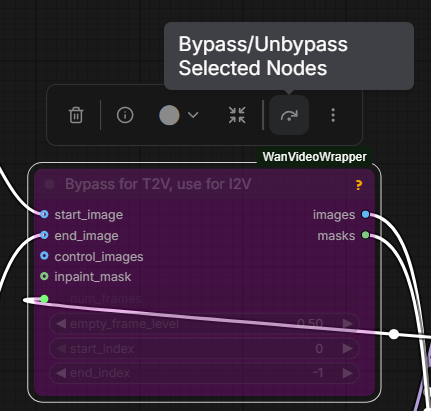 Next, click the specified icon to Unbypass the Start Frame and WanVideoWrapper boxes.
