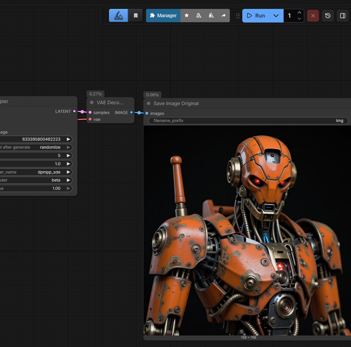 If everything worked correctly, the model will output a red robot, the default prompt for this sample workflow.