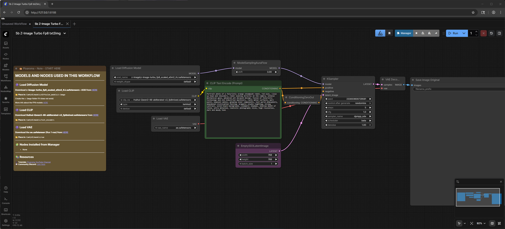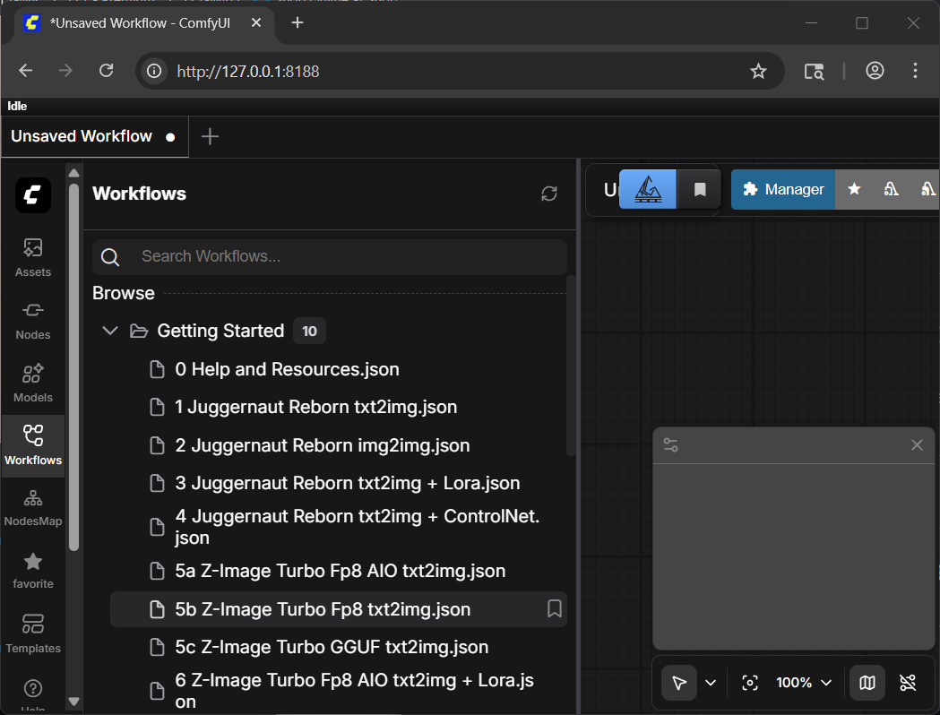 Click “Workflow” on the left panel, and then expand “Getting Started”. Click on “5b Z-Image Turbo Fp8 text2img.json”