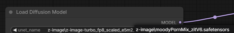 Go back to your browser window with the ComfyUI workflow open. Press F5 on your browser to reload the page. Now click on the model name field in the “Load Diffusion Model” and (optional) click again to select the Moody Porn Mix model instead of the pre-filled default: