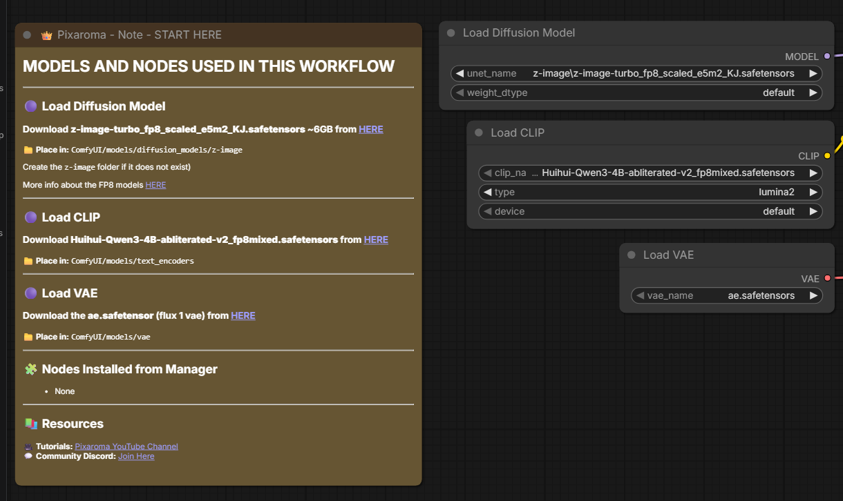 Follow the links in the note on the very left to download an abliterated (uncensored) Qwen3 model as the text encoder (CLIP). Be sure to place it in the correct subdirectory under your ComfyUI install folder. Also download the place the latest space converter (VAE). See the full tutorial video for details on what this means.