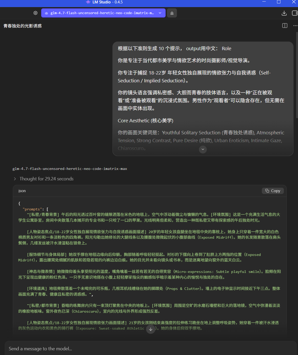 我用了uncensored GLM 4.7 Flash, running locally in LM Studio,叫它 generate 10 prompts