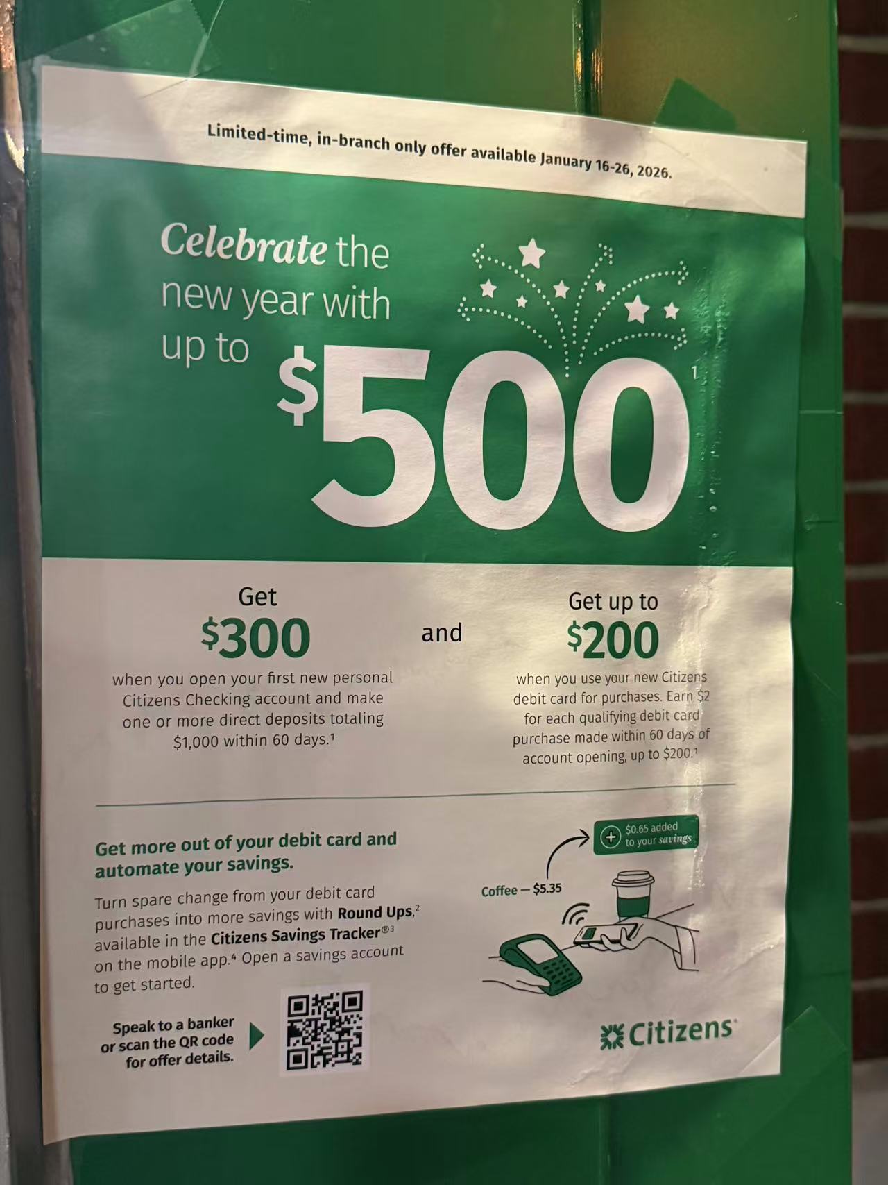 in-branch offer,60天内total DD $1000拿$300。同时开户60天内debit刷一笔给$2(?)