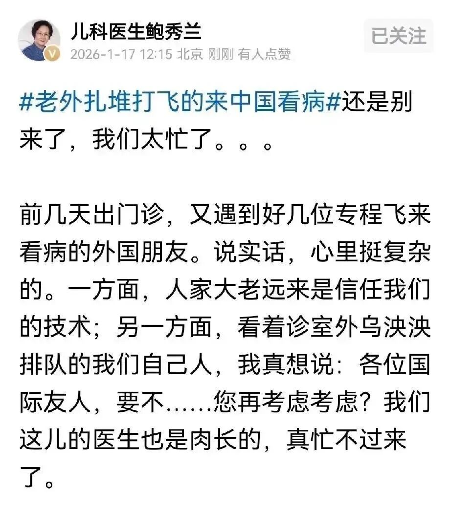 鲍主任说到:“前几天出门诊,又遇到好几位专程飞来看病的外国朋友。说实话,心里挺复杂的。一方面,人家大老远来是信任我们的技术;另一方面,看着诊室外乌泱泱排队的我们自己人,我真想说:各位国际友人,要不……您再考虑考虑?我们这儿的医生也是肉长的,真忙不过来了。”