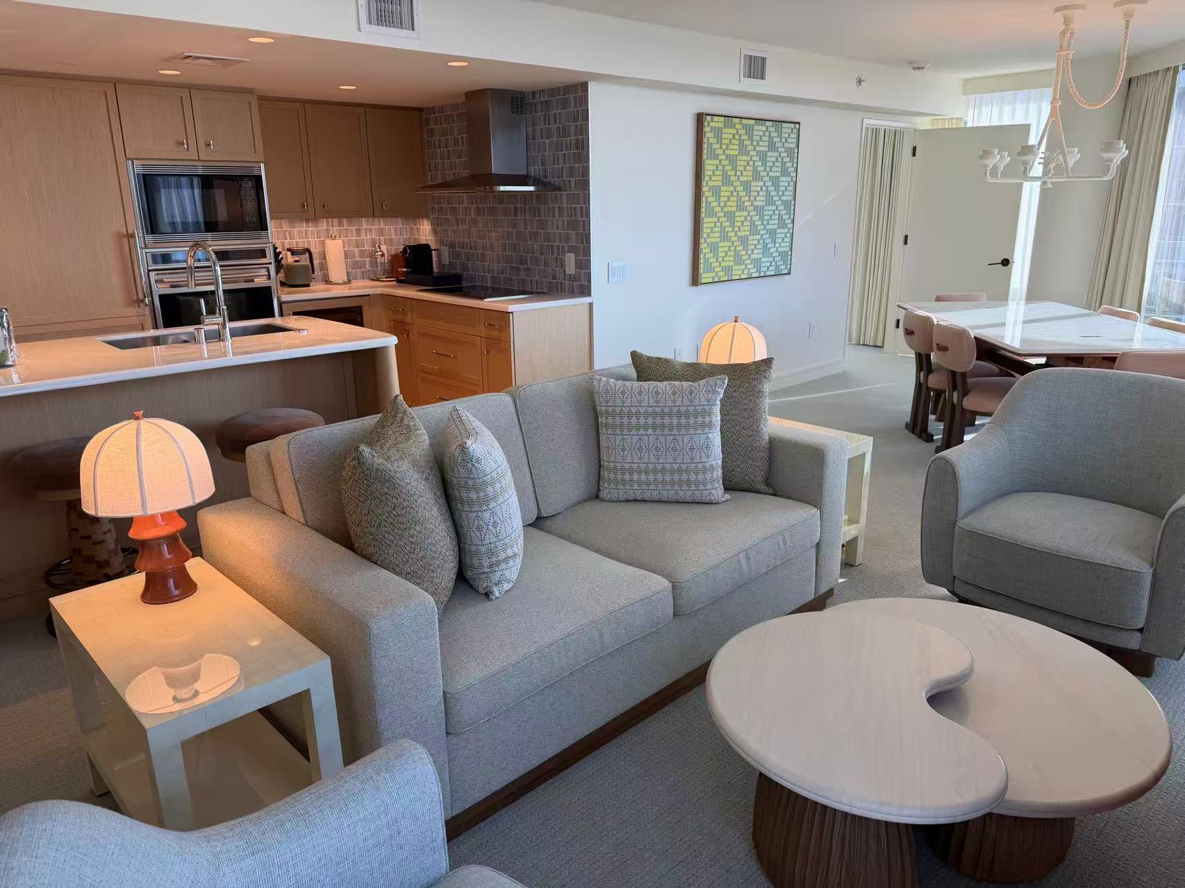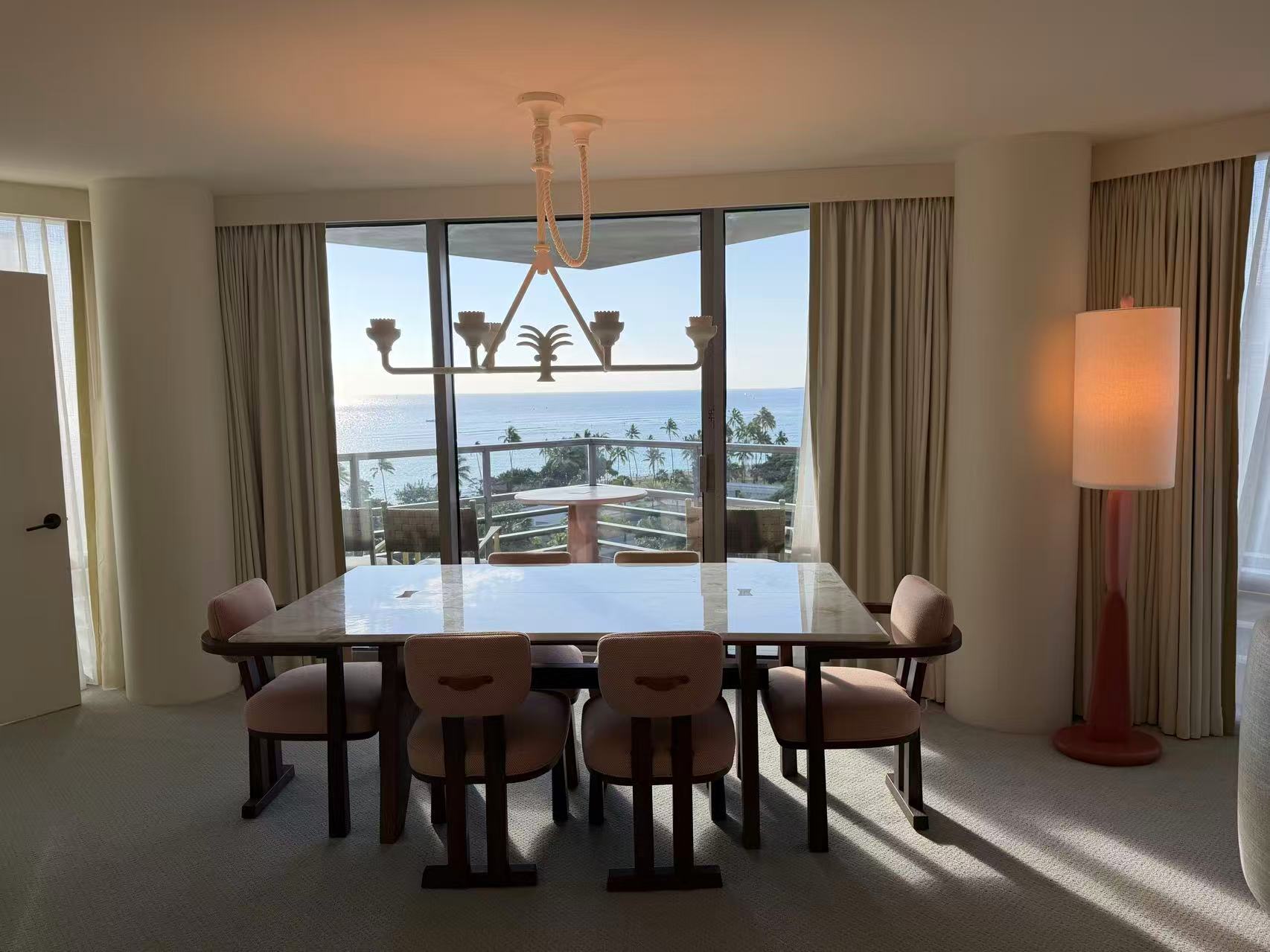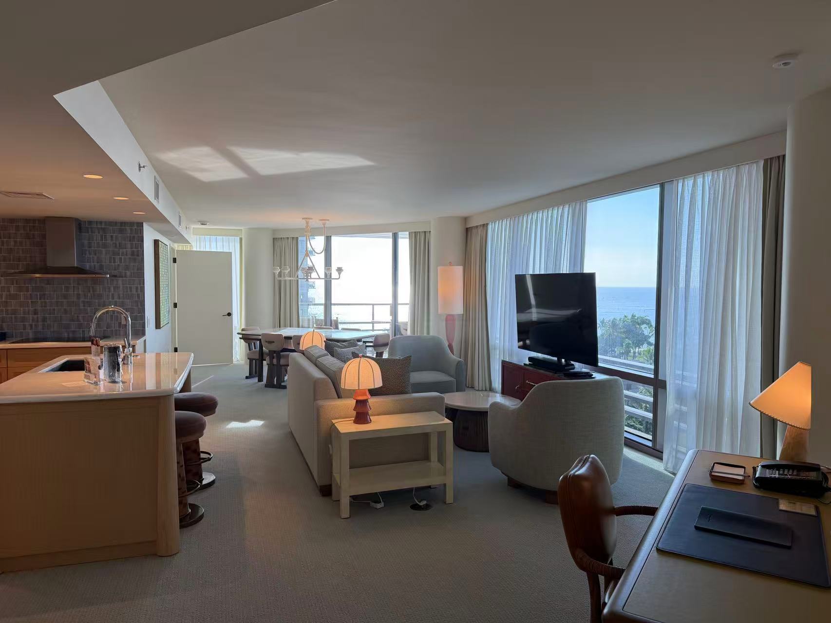 Hilton水钻,用FHR定了第一晚,然后用400k点数付4住5定了后面5晚。本来几十刀住6晚,结果CI的时候前台大叔offer了245+tax (290 total)一晚升级2b套房。带去看了房是partial ocean view然后房间有点buzz的杂音,就商量给“升级”到了低楼层full ocean view的2b套房。确实海景很全,还带一个den,我看原价要2000+,那住一晚岂不是赚1700,6天能赚1万刀就冲了