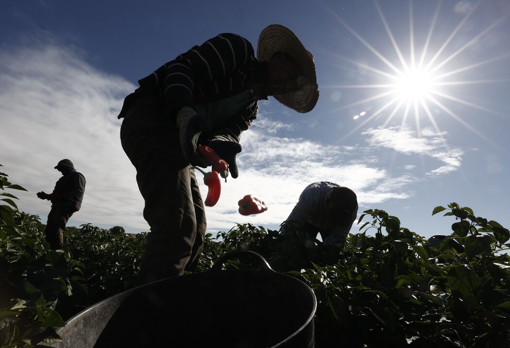 2022年,西班牙洛多萨的农民正在劳作。移民劳动力在农业、旅游业等领域发挥着关键作用。 Jesus Diges/EPA, via Shutterstock