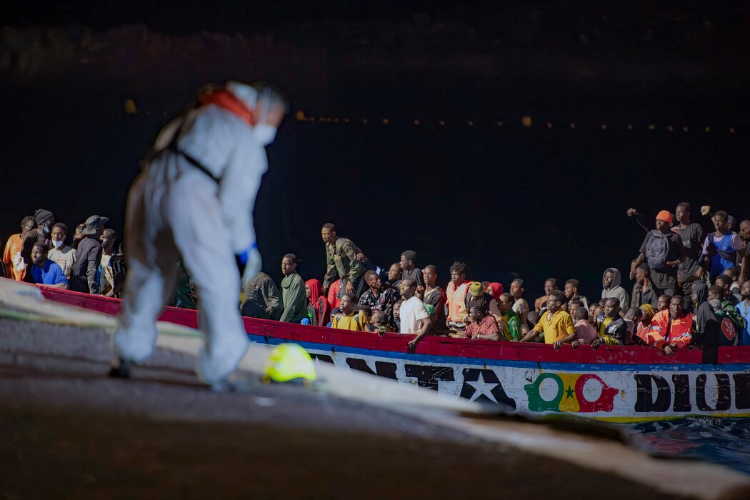 2024年,非洲移民乘船抵达加那利群岛的埃尔耶罗岛。 Antonio Sempere/Agence France-Presse — Getty Images