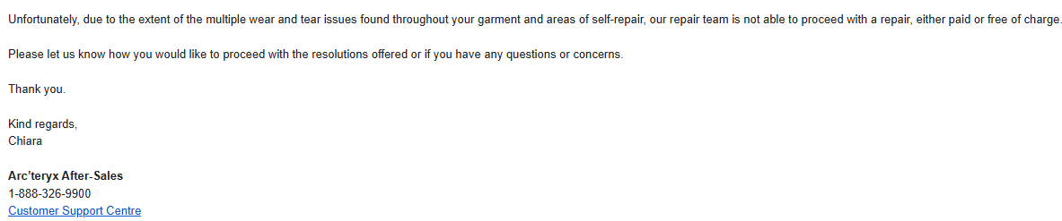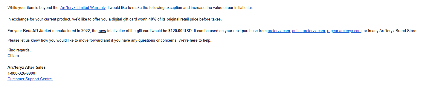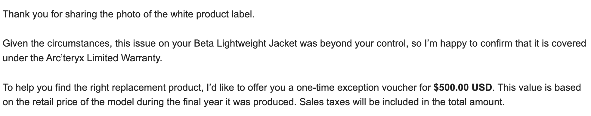 始祖鸟售后真的很好,曾经买过它家的手套然后坏了,给了我40%的coupon,上限1000USD,比手套的价值高