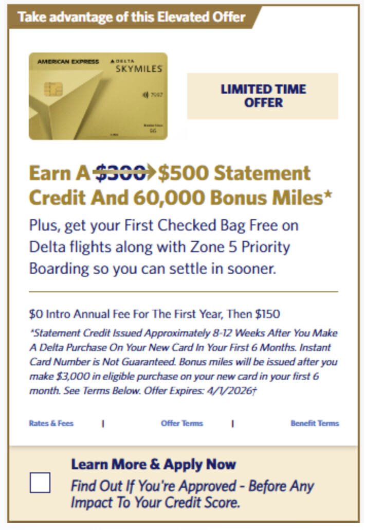 dummy book怎么定:打开delta 不要登录 订一个贵点的票 比如JFK to PVG first class round trip 现金票 然后结账 结账界面就会显示(类似下图)。当然有随机性(试VPN和隐身模式)。大家可贡献dp. dummy booking就行不用真的订。 然后点Apply for the Delta SkyMiles Gold American Express Card. 再点Continue to Review & Pay 就能看到application页面,offer是一样的。商业gold目前没有看到这个500+60k的。知道怎么触发的可以补充。