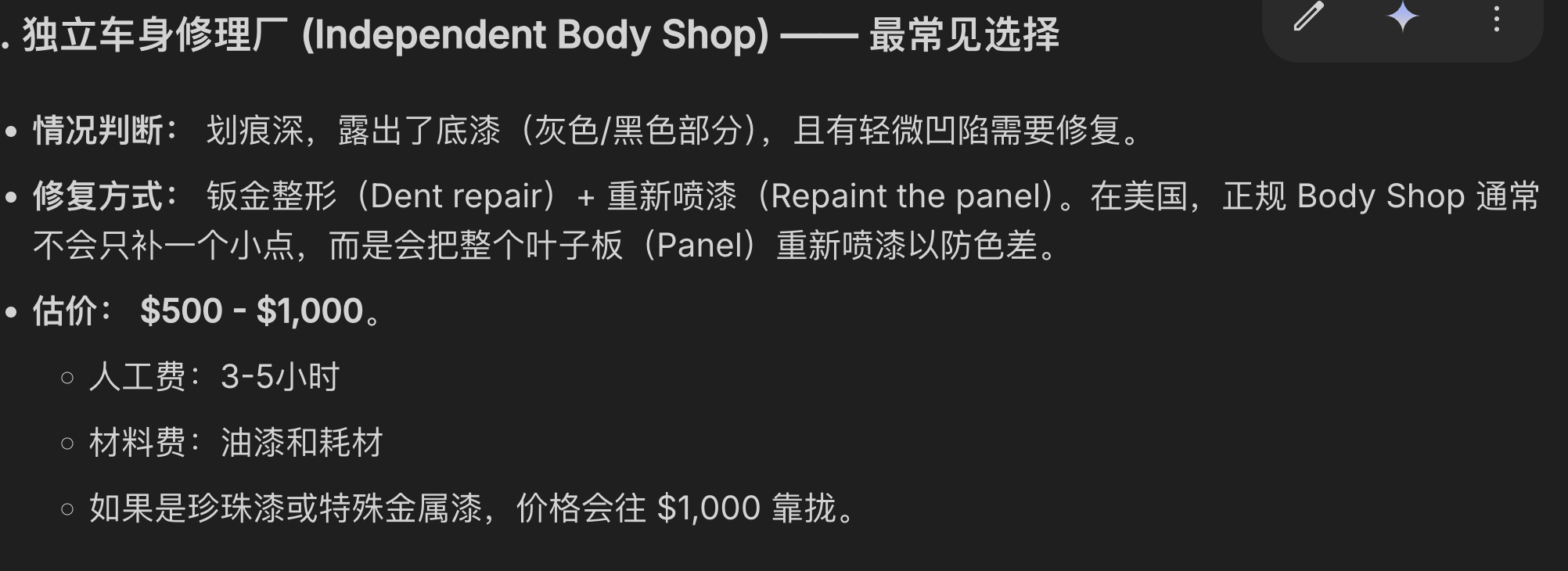 Update:去bodyshop estimate了一下,的确是塑料件。换新加喷漆 一共532,其中配件三百多。商议了一下赔了650。看起来他也没打算修。他说,之前报的价格纯是GPT瞎说的,大部分是下雪的融雪剂,判断成划痕了,所以给了居高的价格。