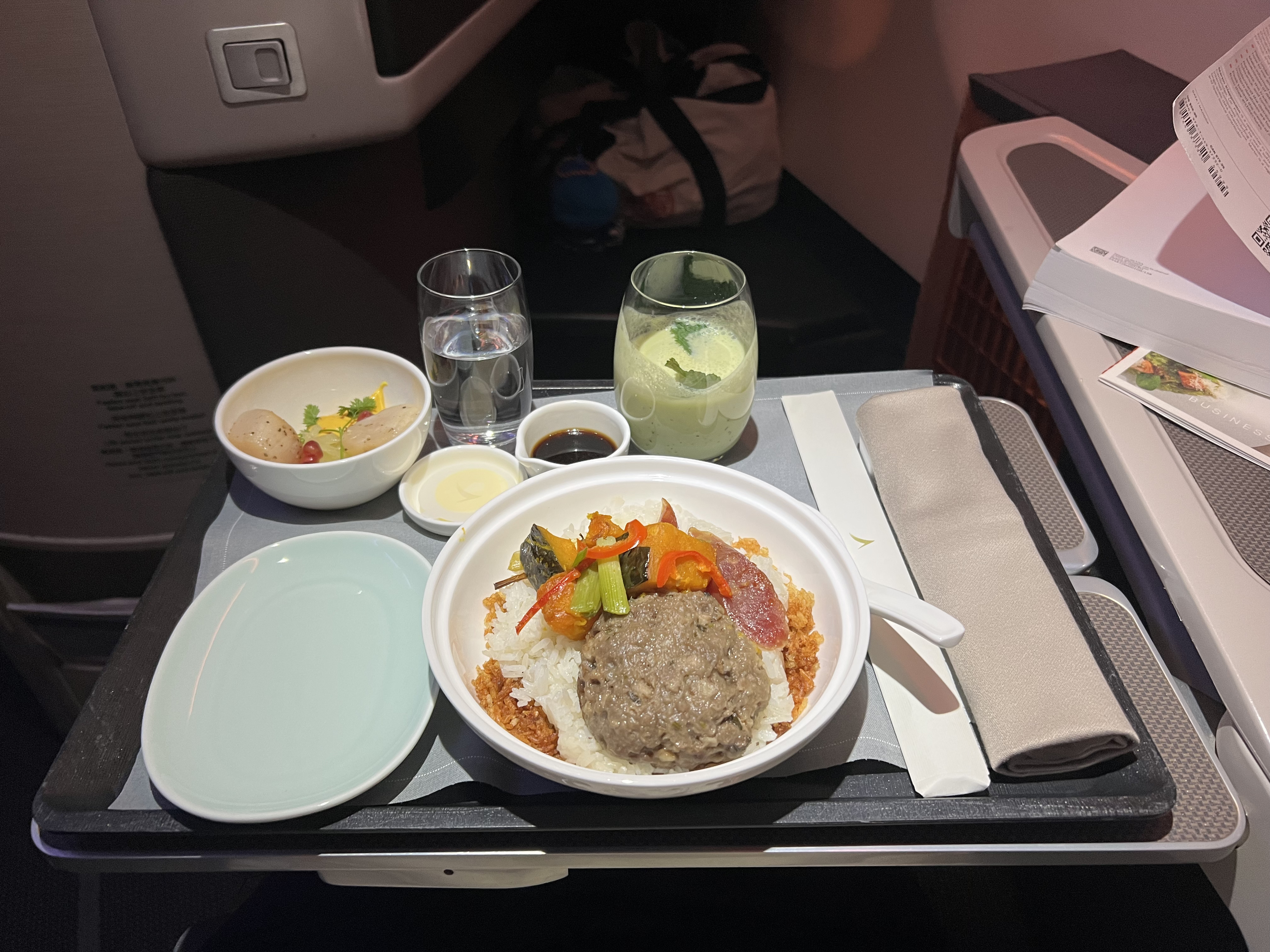 个人感觉CX的餐饮在top 10 business class里算是倒数的。和ANA坐一桌