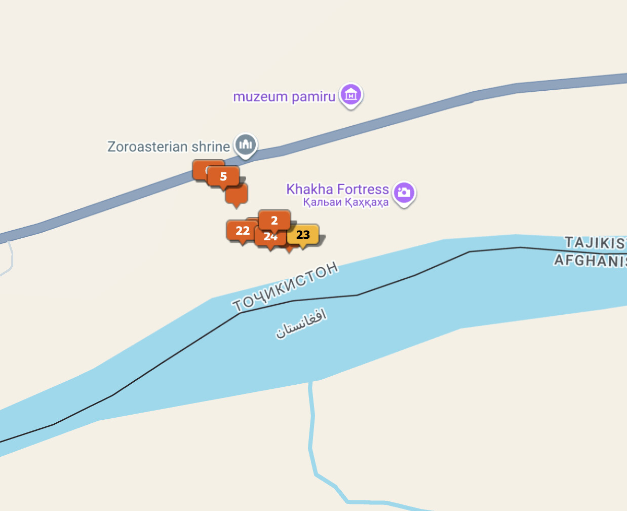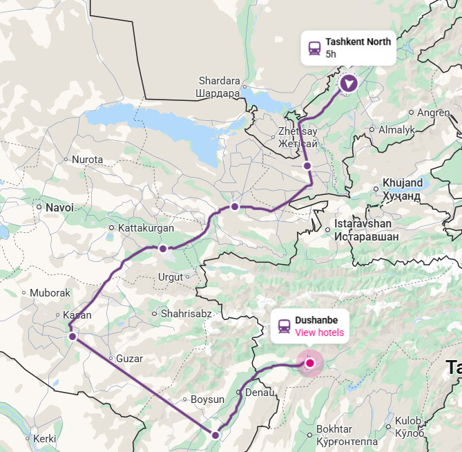 另外,从塔什干/撒马尔罕 → 杜尚别可以乘坐国际列车,每周至少一班,路线如下。这列车开得很慢,从下午发车18小时,第二天早上到,所以适合省钱或者苏联火车爱好者。