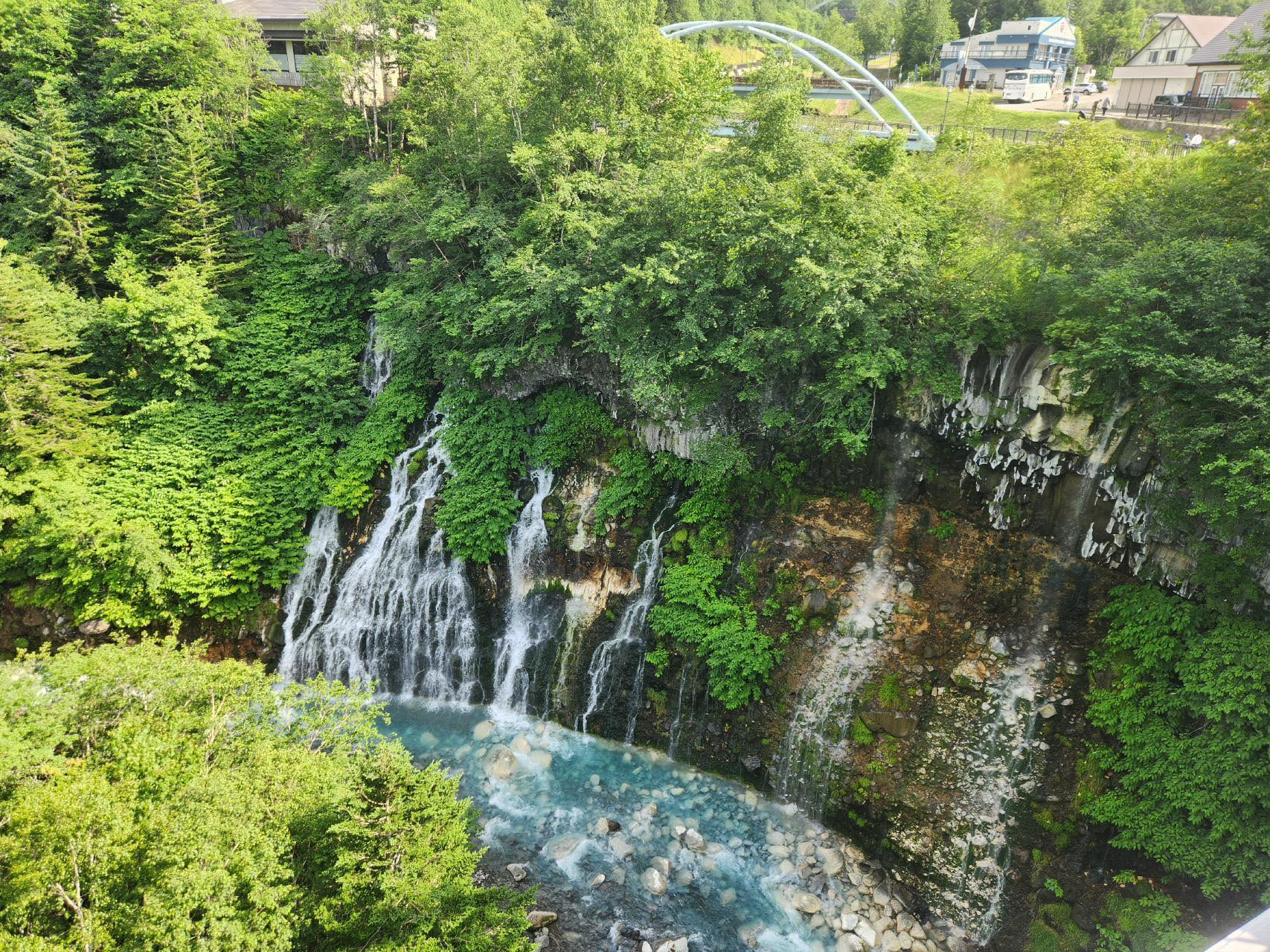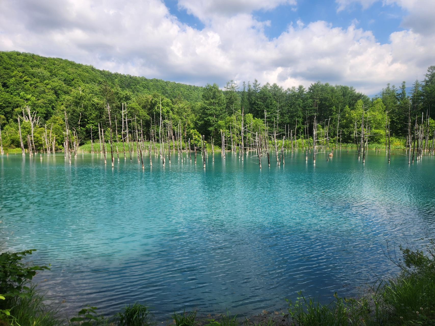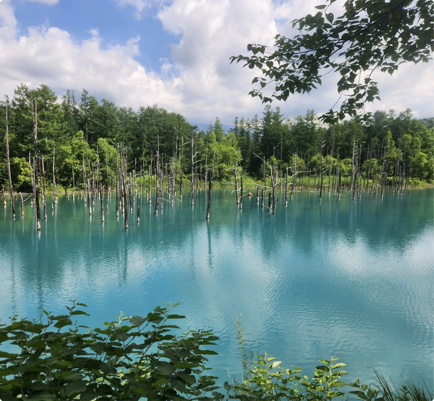 从千代田农产出来,我们的下一站是当地最有名的景点:美瑛青池和白须瀑布。美瑛青池曾经是苹果电脑的默认壁纸之一,也因此名声大噪。青池不深,清澈见底。中央的池水在阳光下呈现出明亮的青蓝色,靠岸边的池水则是优雅的深蓝。仅论池水的话,不及九寨沟的瑰丽与开阔。但青池中树立的落叶松和白桦树赋予这片池子独特的美感。树木被水长期浸泡早已枯萎,只剩下黑白相间的枯树干在池中参差错落,营造出独特的历史感和荒芜感,与静谧的池水一起,构成了一幅刹寂风的杰作。