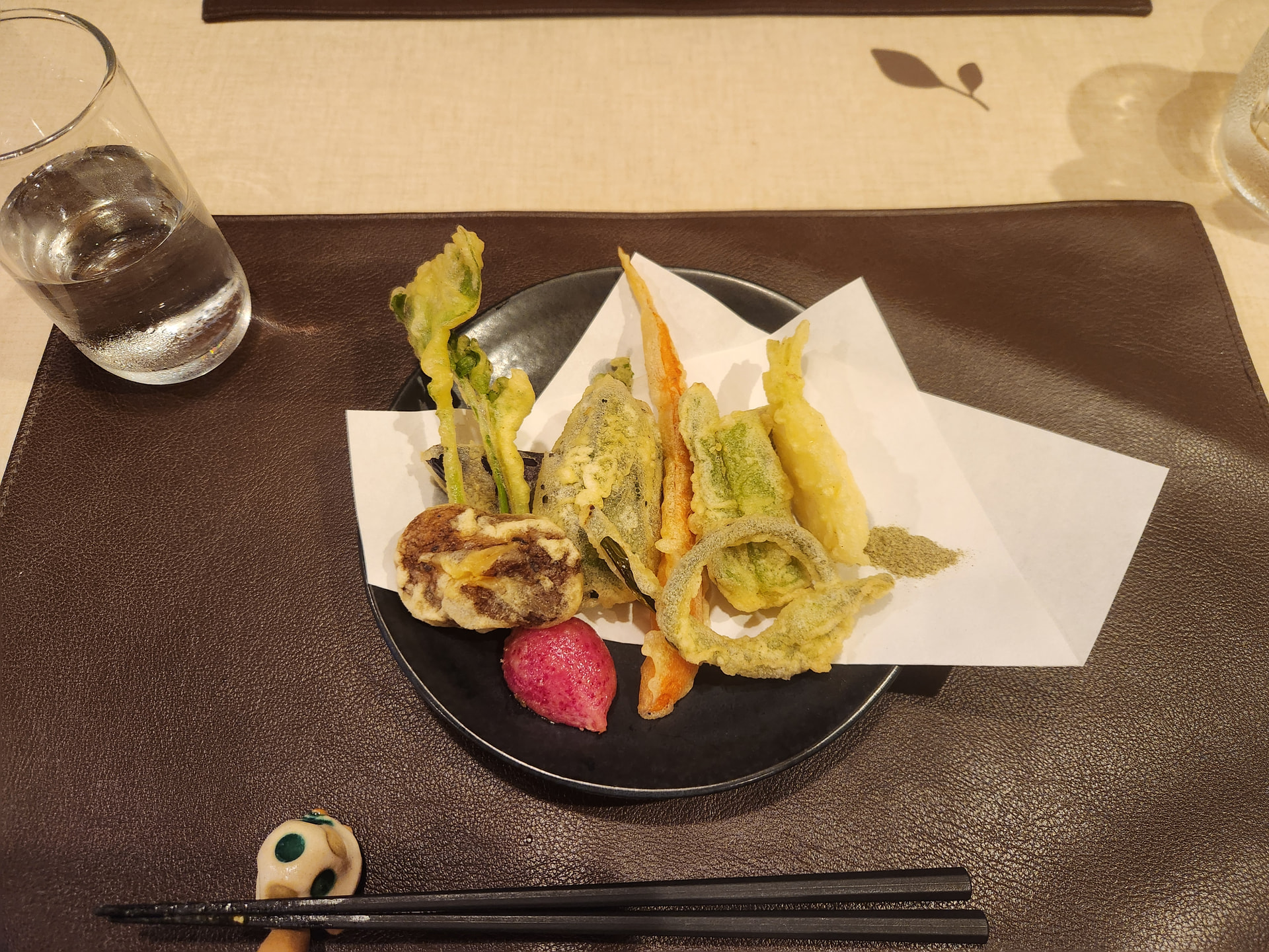 炸物是蔬菜天妇罗拼盘,都是当地的新鲜蔬菜,面衣轻薄爽脆,配的粉料很好吃。
