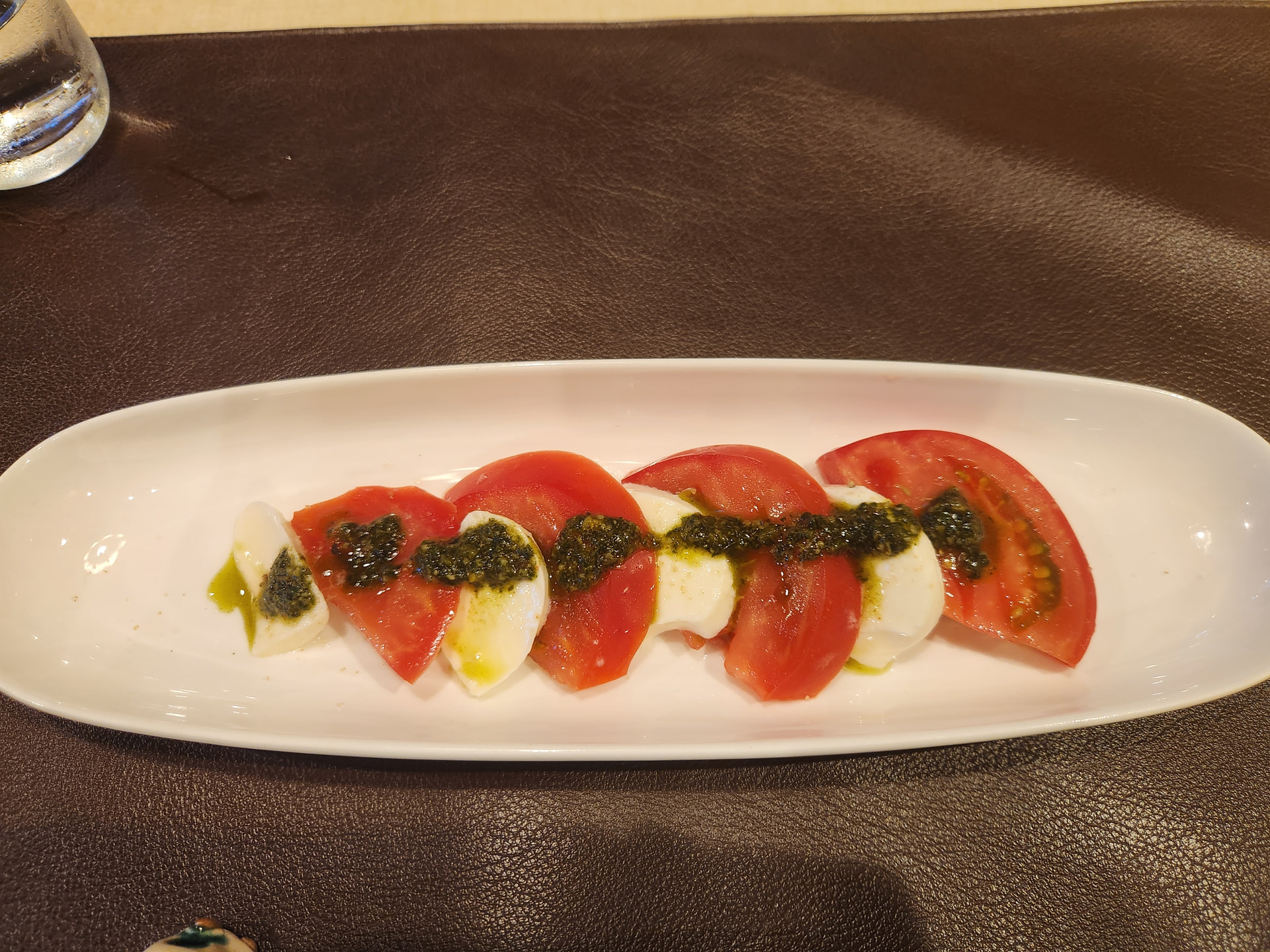 冷盘是西红柿和马苏里奶酪。依旧没有亲尝。