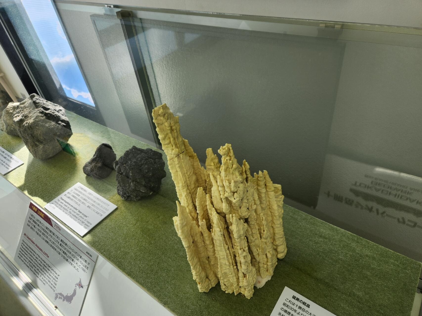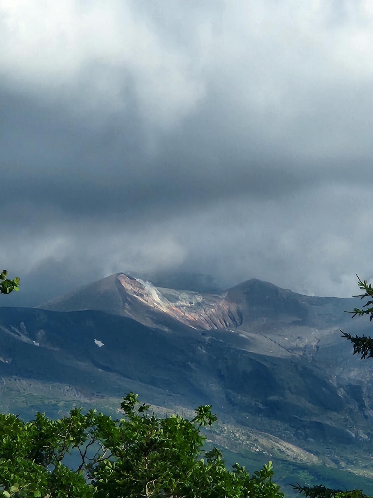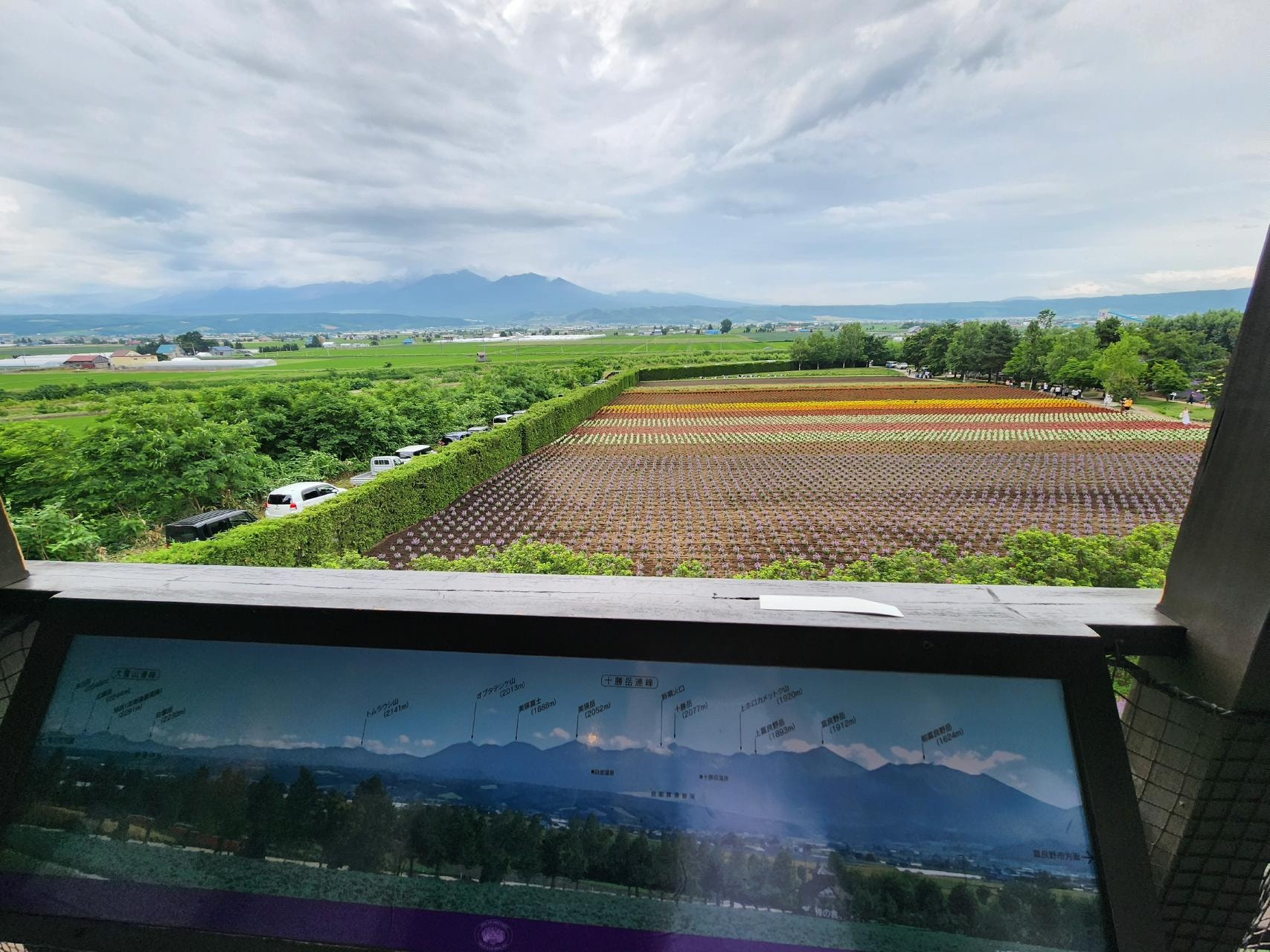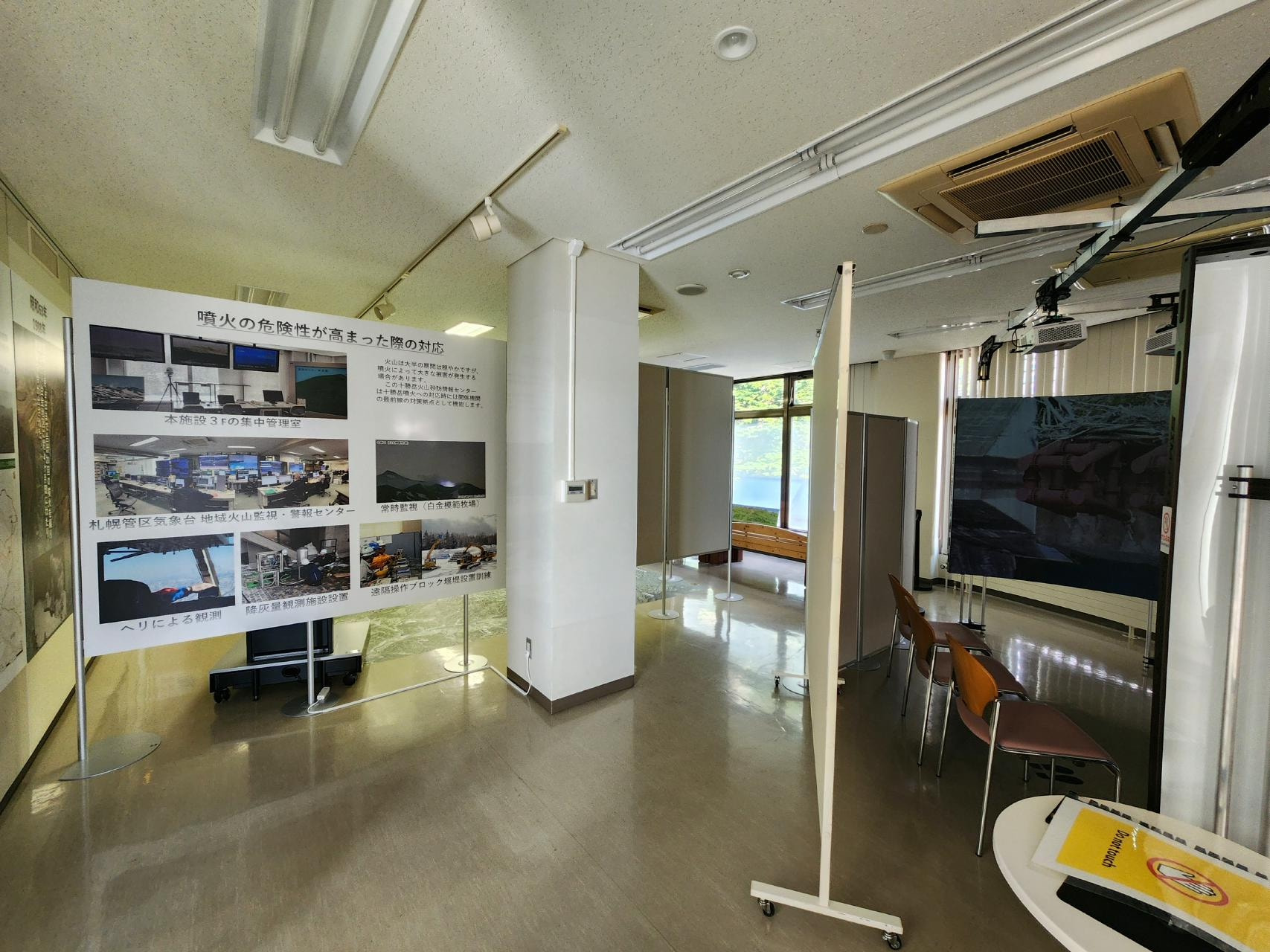 经过几轮休息,我们终于爬到了山顶。上面有一大片开阔的空地,是附近的火山避难所,唯一的建筑是三层楼高的十胜岳喷火防灾资料馆,和旁边的火山监测塔。我们进入馆中休息,顺便参观学习关于火山的知识。馆里人很少,但是资料丰富有趣,详细介绍了周围的地质历史和防灾经验,还可以眺望远处的火山,很值得一去。
