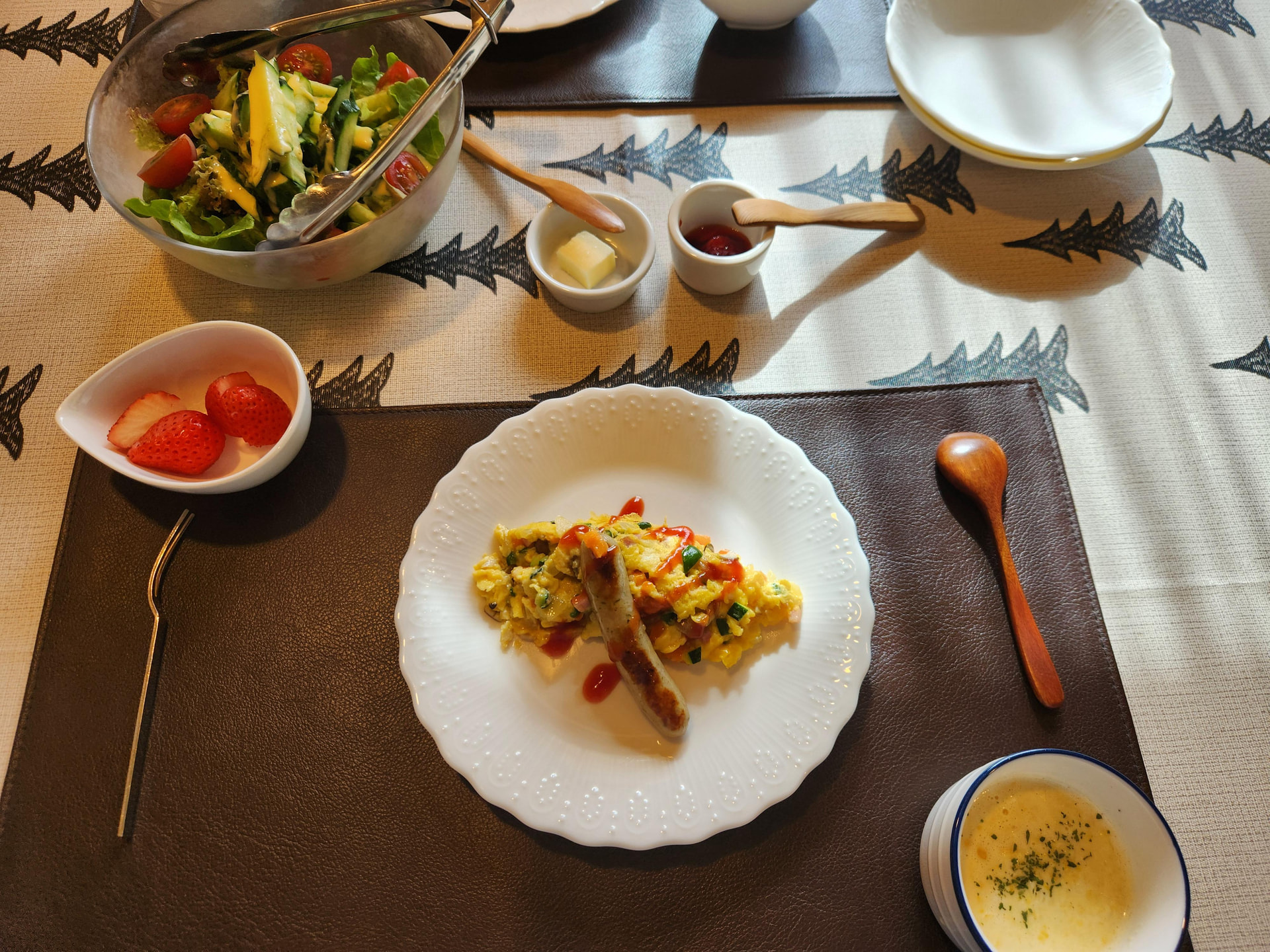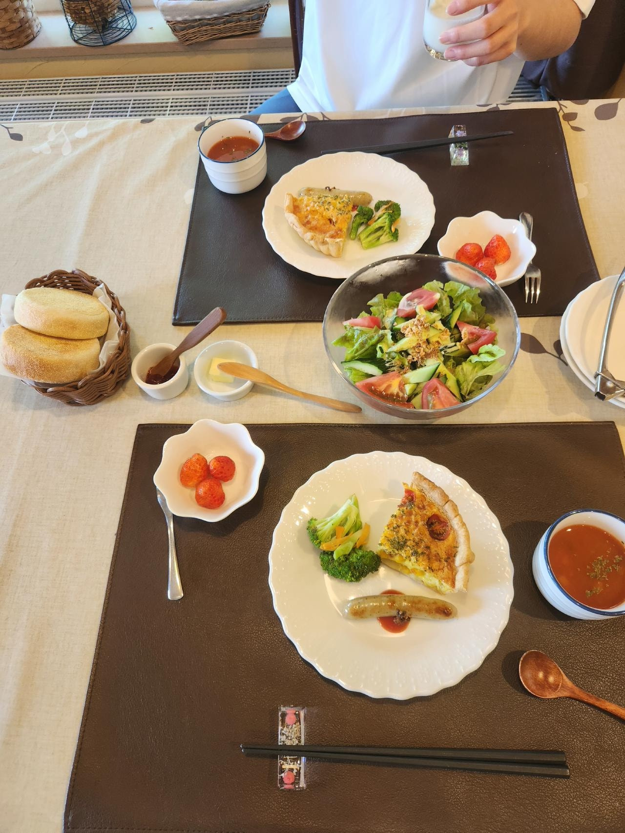 第四天早上,我们在民宿的小屋中被鸟儿唤醒。7点半左右,女主人已经准备好了早餐,有omelette, 香肠,沙拉,草莓,烤吐司和早餐包,玉米浓汤,还有各式饮品(牛奶,果汁,水,茶,咖啡)。配面包的是黄油和自制的果酱。所有食物都装在恰如其分的容器里,搭配着可爱的餐具。早餐很美味,据说沙拉里的蔬菜、草莓和鸡蛋都来自当地农场,确实非常新鲜可口。