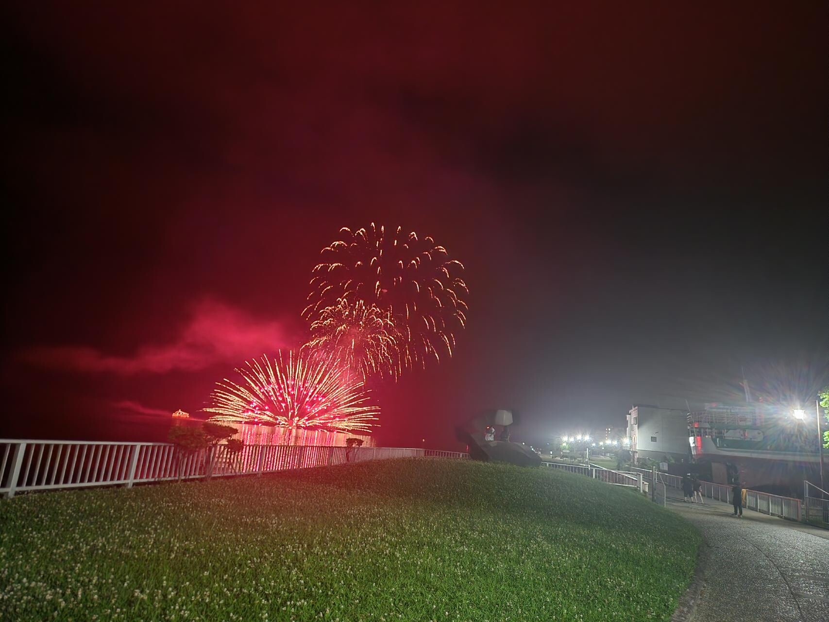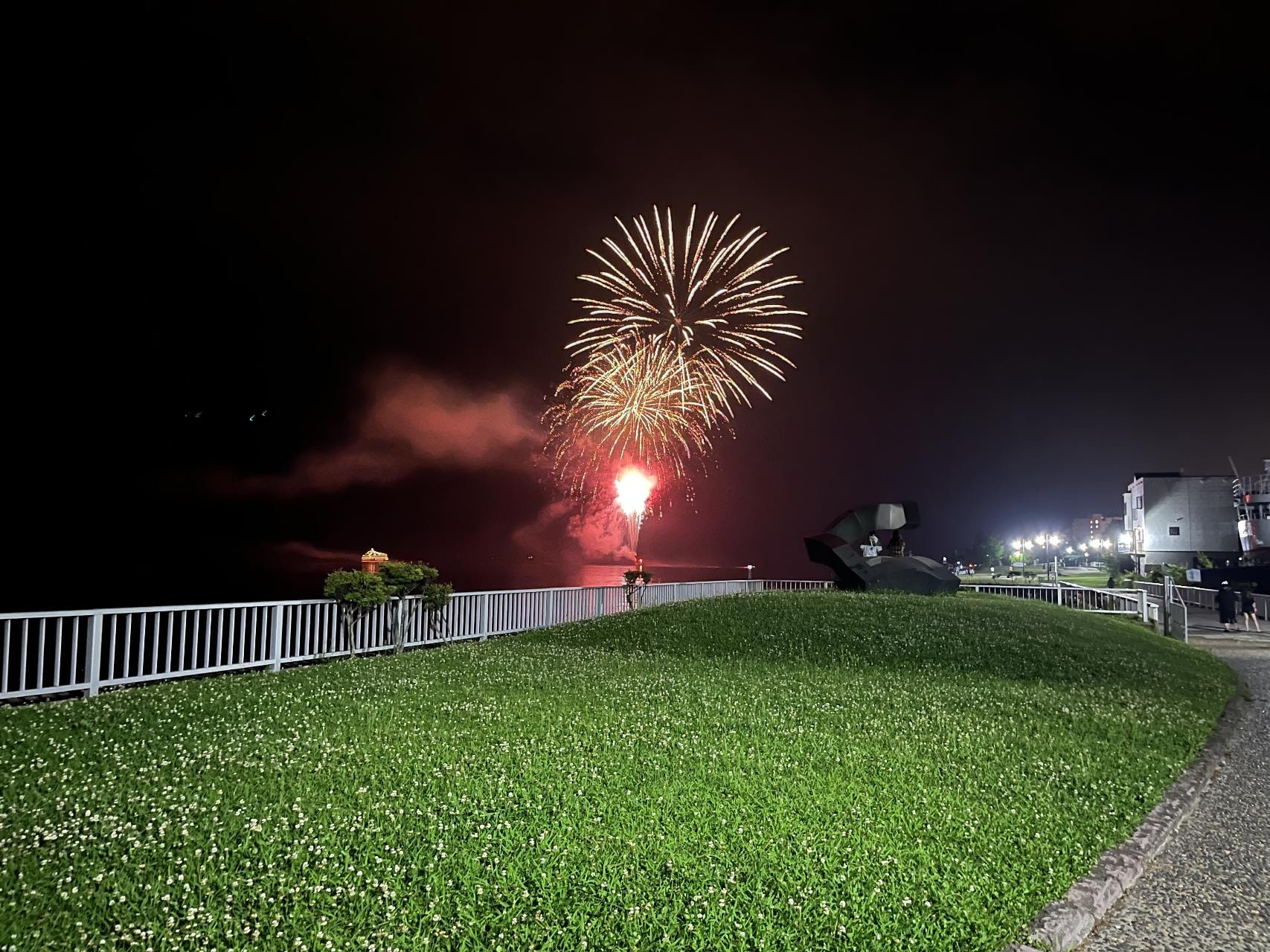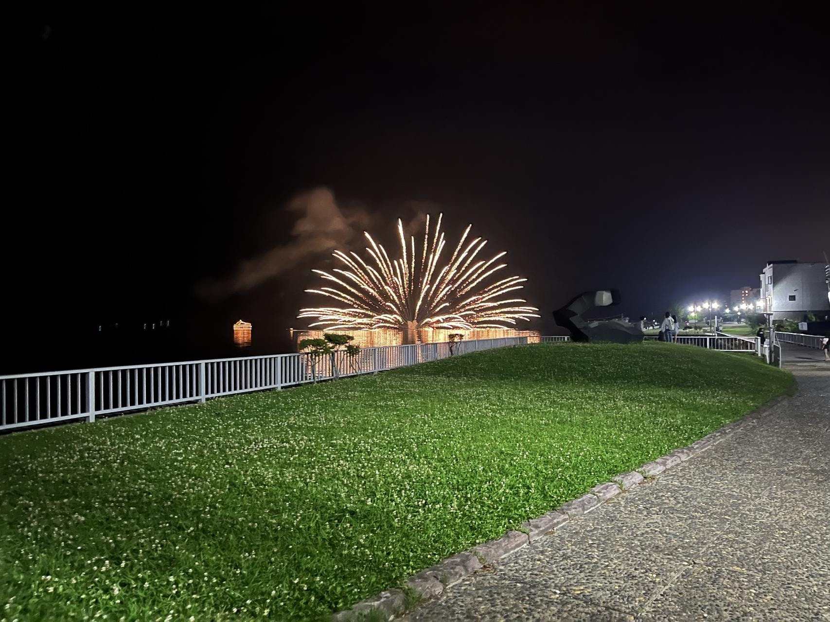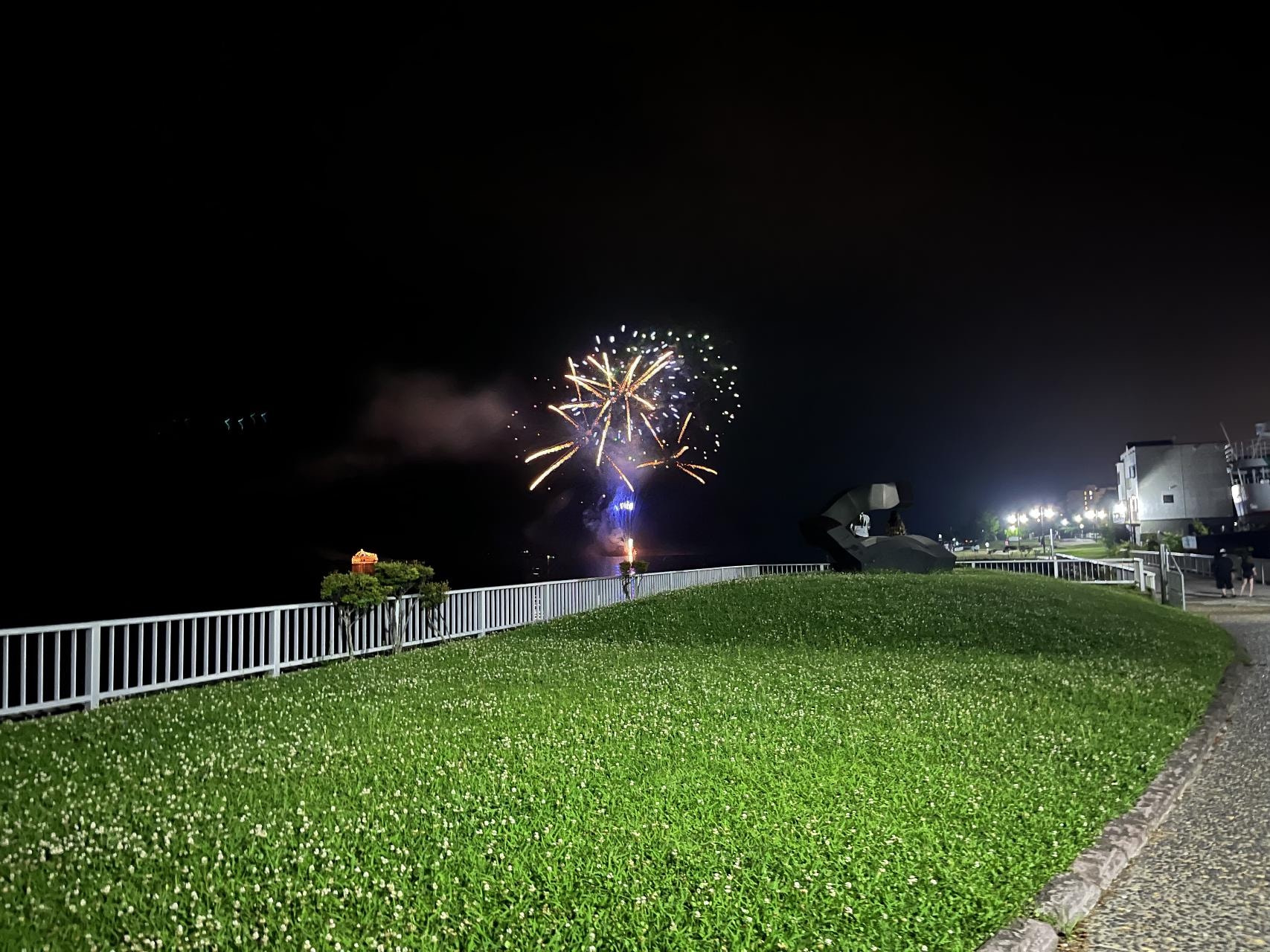 但洞爷湖的烟花小小的,放的稀稀疏疏的,离我们远远的,周围空空旷旷、安安静静的。原来看烟花还可以这么看。