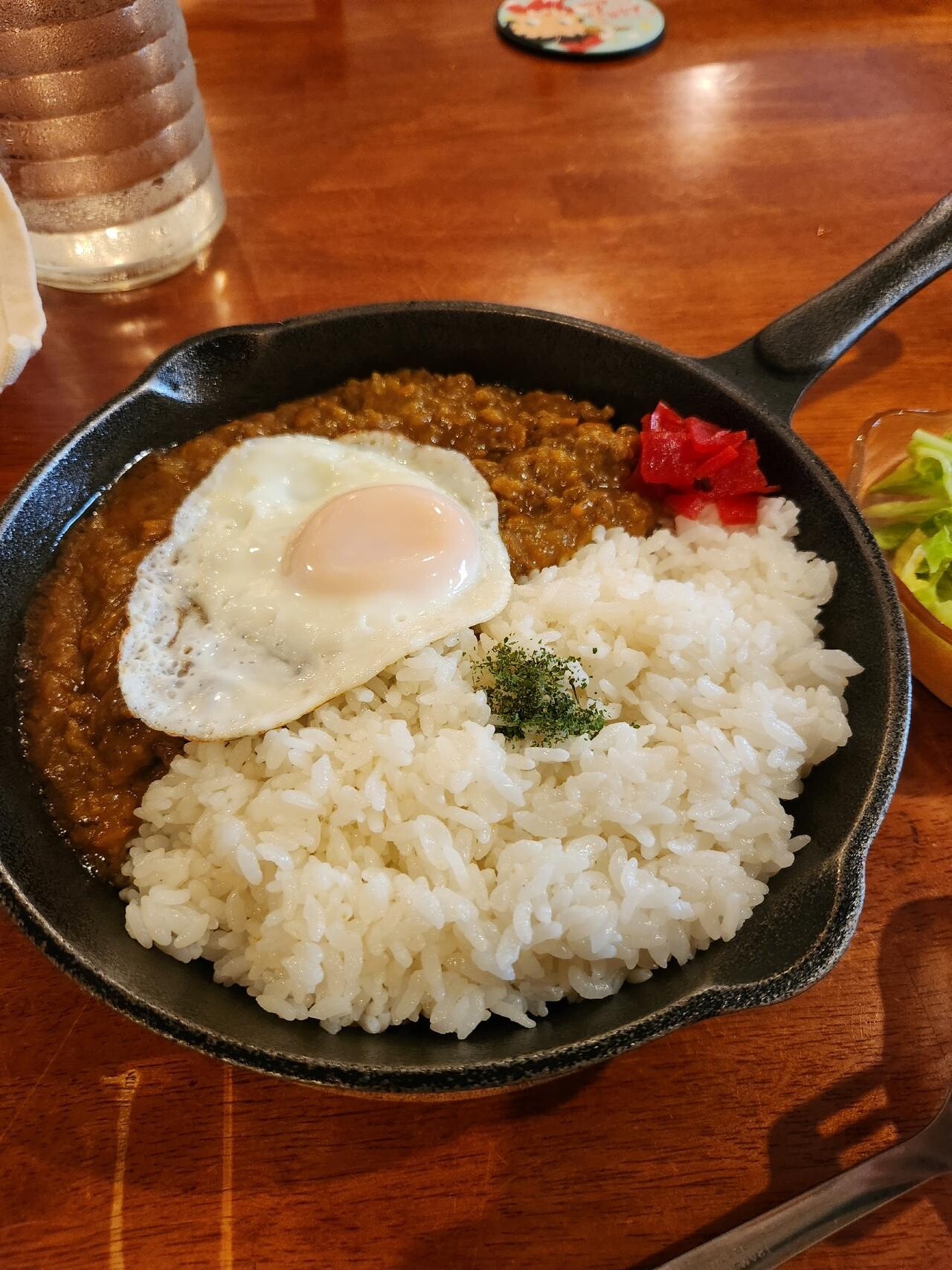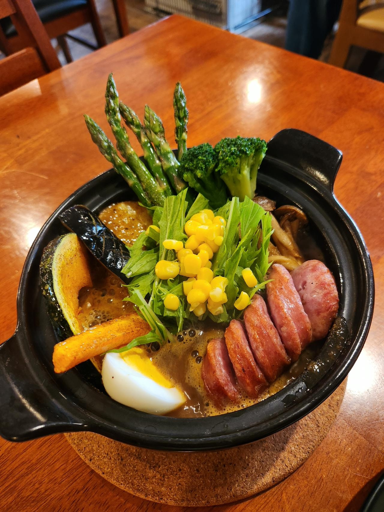 我们点了一份汤咖哩和一份传统咖喱。店家说汤咖哩的配菜都来自当地的农场。香肠肉香浓郁,肥瘦适中,微微带甜口。蔬菜非常新鲜,没有调味也很鲜甜。每家汤咖哩店都有自己的秘方,这家汤底的味道和在札幌吃的那家明显不同,汤汁更浓郁,草药味更淡,也非常好吃。传统咖喱搭配的是牛肉碎和流心蛋。咖喱鲜香醇厚,但吃完一大份都不觉得腻。