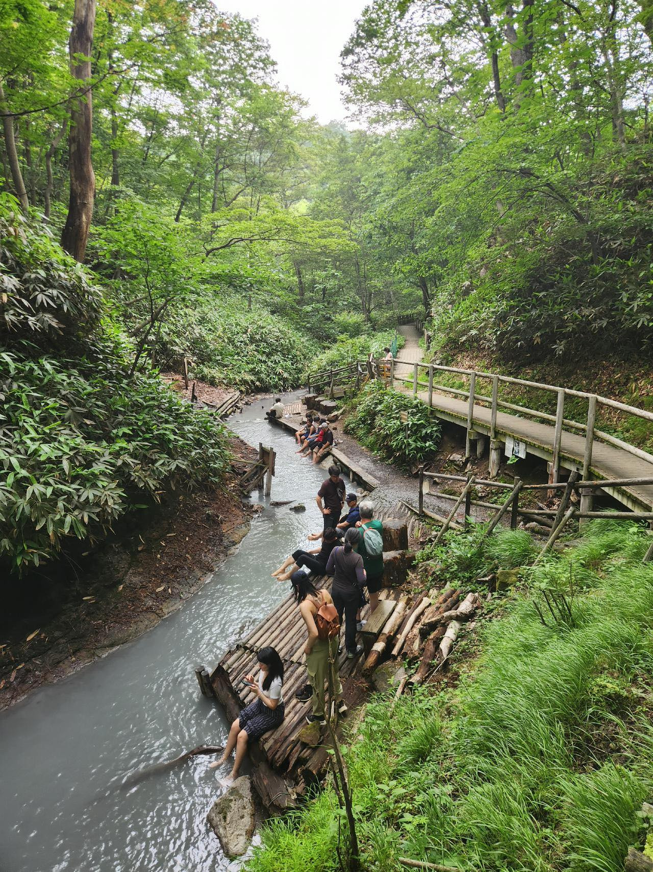 参观完大汤沼,我们来到一条温泉溪。溪水不深,水温在40度左右,山林的美景和天然的温泉吸引了不少游客来此休息泡脚。我们在溪边泡了半小时左右,之前徒步的疲惫一扫而光。