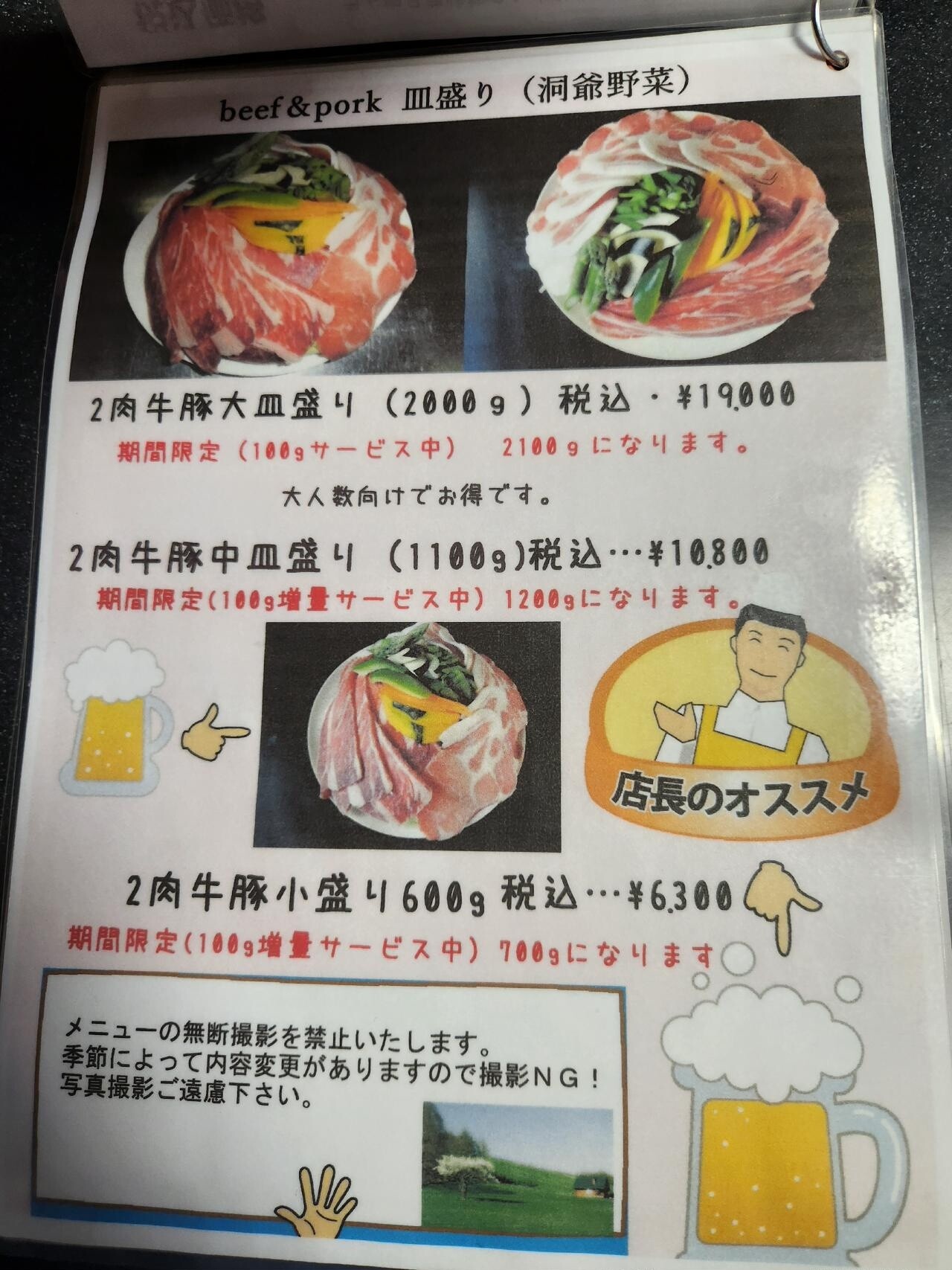 于是,按照老板娘的规则,我们眼巴巴地看着小伙子点菜、上菜、吃菜。等到他终于吃完,老板娘才开始招待隔壁桌的夫妇。我们只能又看一遍他们点菜、上菜、吃菜。一个多小时过后,终于轮到我们点菜了……菜单上只有两种菜品:烤肉和拉面。烤肉只有牛肉和羊肉,外加一些蔬菜;拉面只有两种口味(另外两种售罄)。我们选了羊肉和蔬菜拼盘,外加一碗味增拉面。