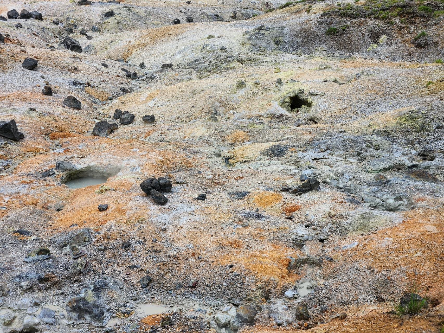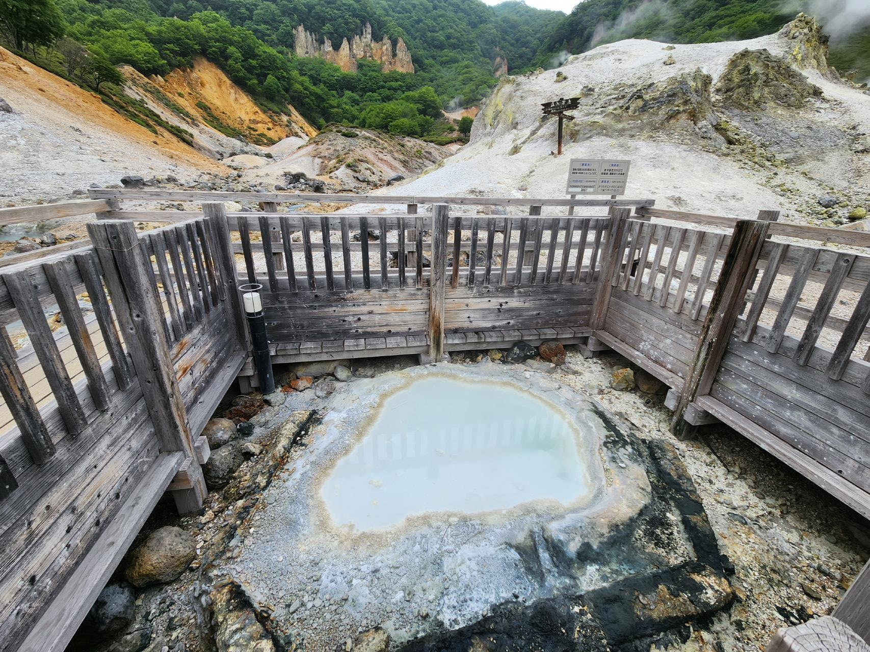 地狱谷是一个火山口遗迹,由约一万年前日和山火山喷发形成,是和黄石公园类似的地热景观。我们沿着木栈道参观,裸露的岩石呈现红褐色和灰白色。随处可见喷气孔喷出浓浓的白烟,弥漫出强烈的硫磺味。大大小小的温泉眼里涌出颜色各异的泉水, 蒸汽升腾。