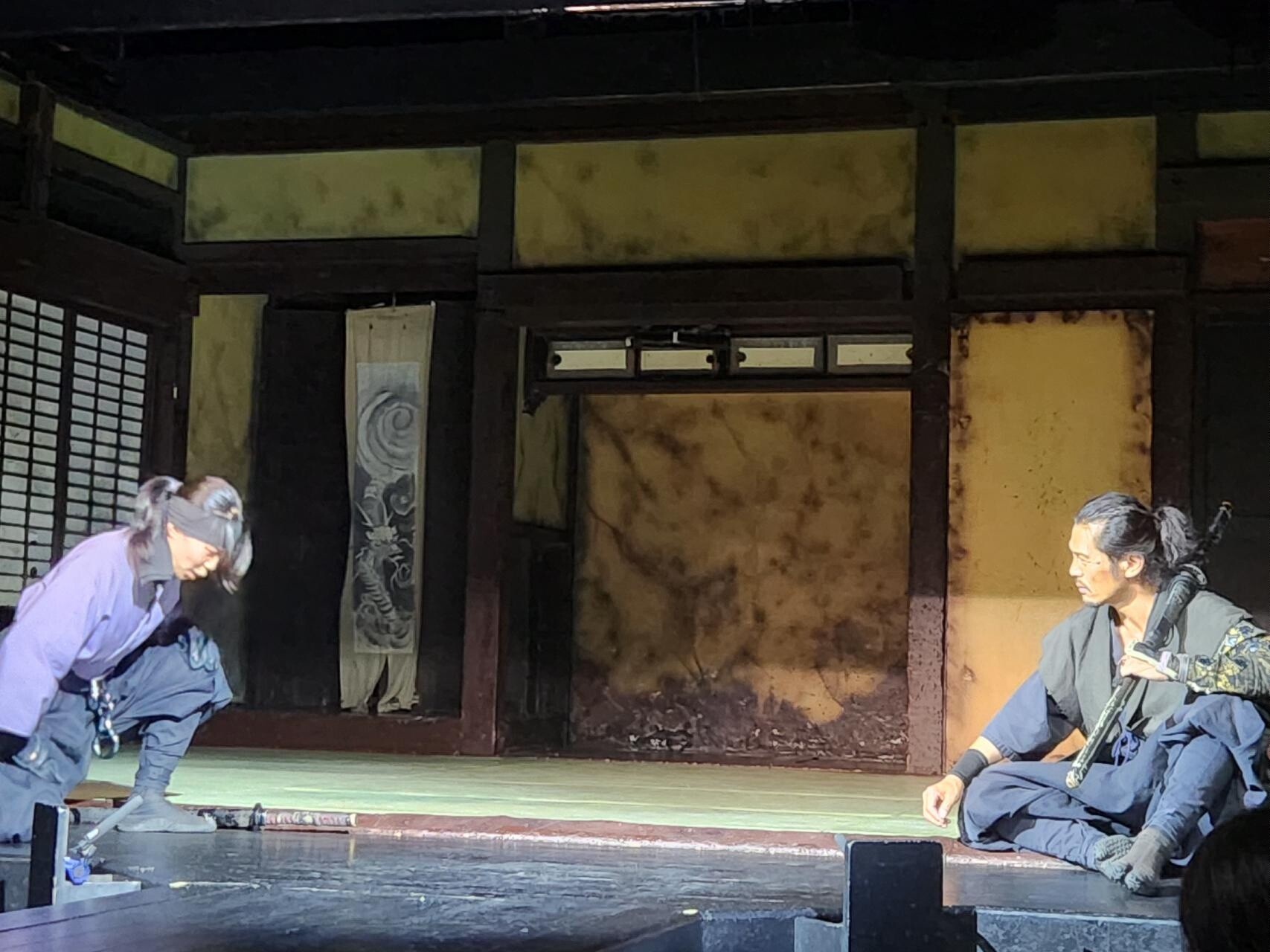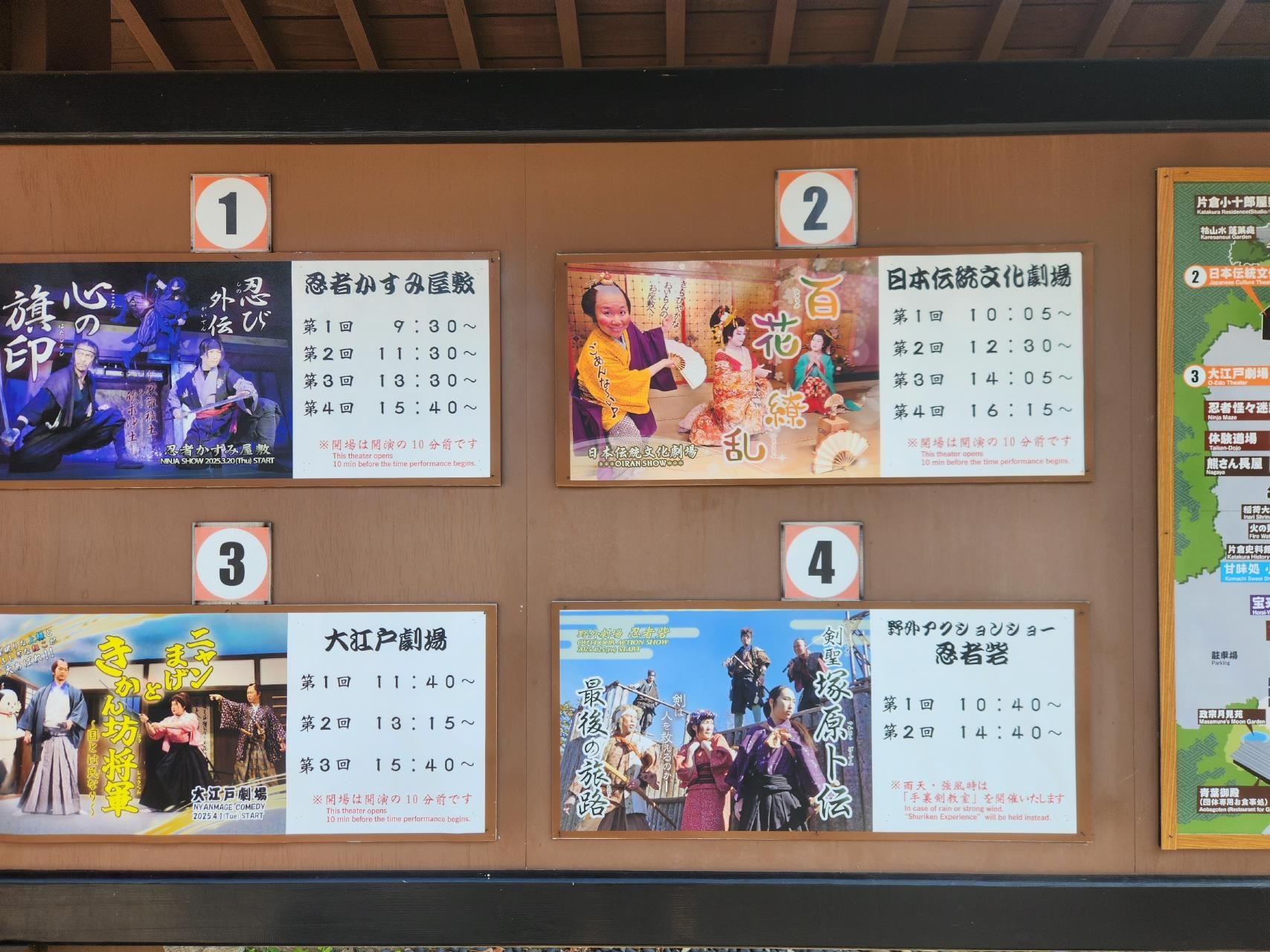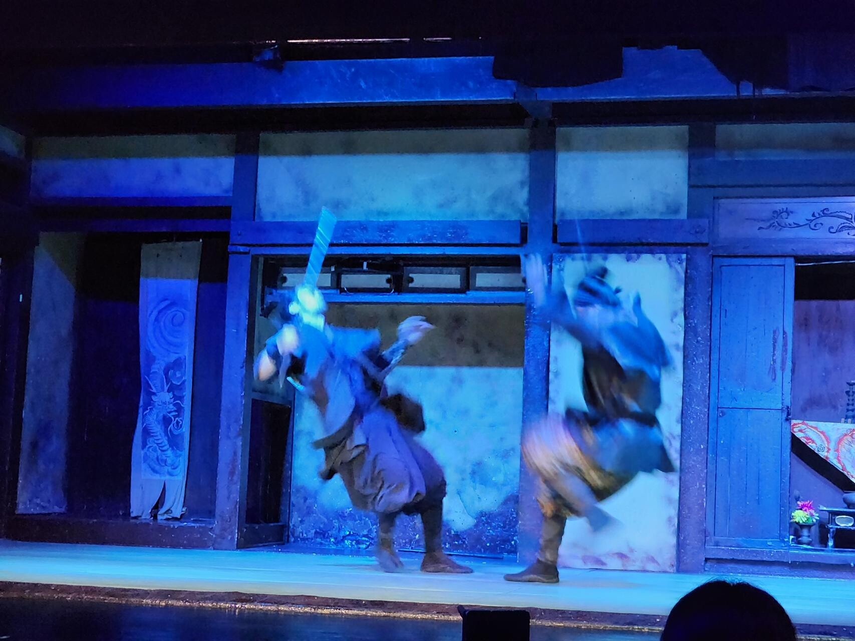 我们参观了学校、忍者馆、恐怖屋等等,还看了两场小剧场表演。忍者秀讲述了伊达政宗家的忍者如何联手一名神秘忍者,共同对抗丰臣秀吉家的忍者的故事,是一部展现忍者打斗的动作片。花魁秀是一场和观众互动的喜剧表演,展现了花魁招待日本将军时的游戏和表演。有搞笑的互动,也有花魁优雅的歌舞。