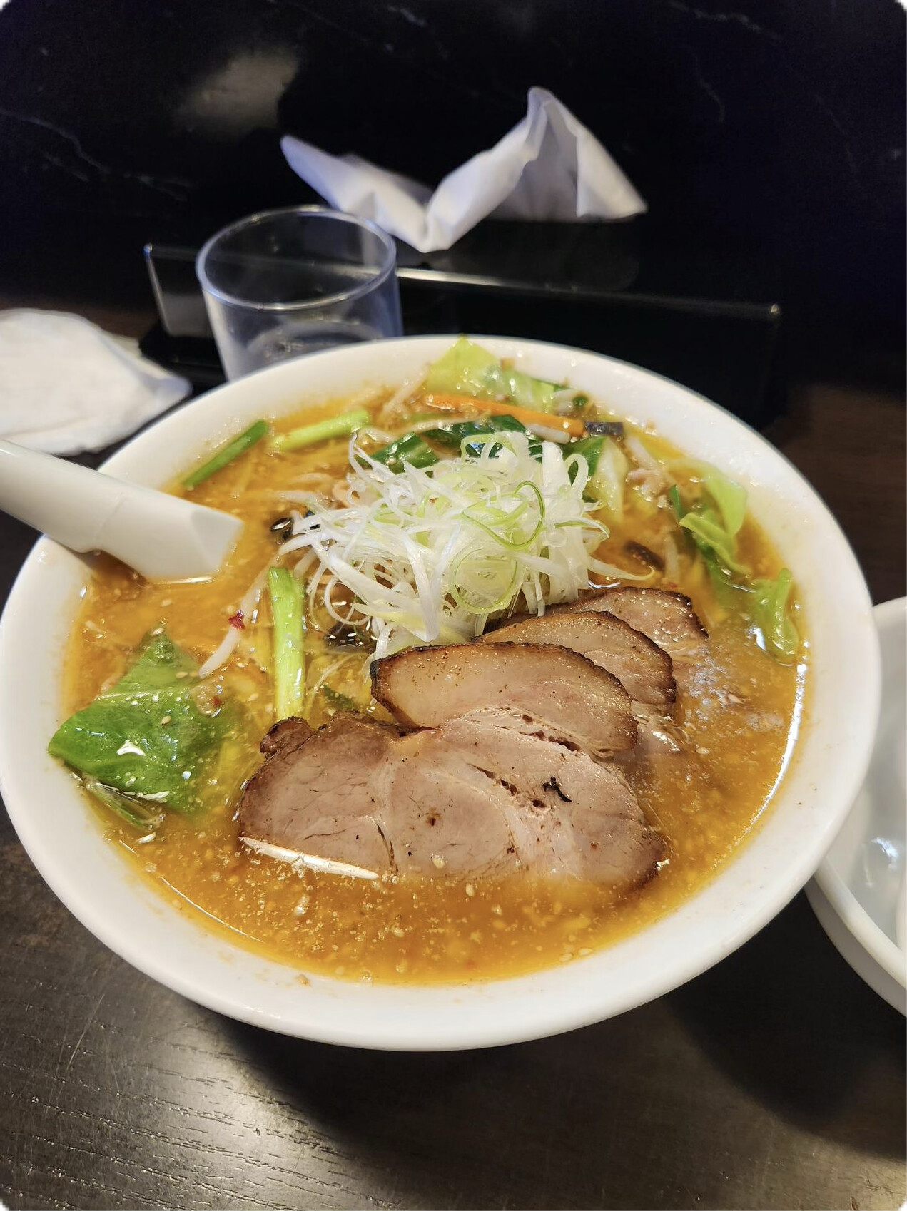 味增汤底浓郁咸香但没有过于重口,拉面顺滑弹牙软硬适中,大片的厚叉烧浓香入味,吃起来非常过瘾。面里还有肉末和微微汆烫过的豆芽、包菜、萝卜等蔬菜,加上葱丝,完美平衡了汤底和叉烧的厚味,让人吃起来既满足又不觉油腻。一人分的面大大的一碗,足够我们两人分。坐在我旁边的的小姐姐点了玉米黄油拉面,似乎是很受女生欢迎的选项。下次有机会再来试试。之前吃博多拉面感觉比较失望,因为汤底很咸,面又硬,除了面只有葱丝的搭配单调乏味,让人很难理解这面为何如此有名。在札幌吃到的这一碗面让我重新燃起了对拉面的兴趣。
