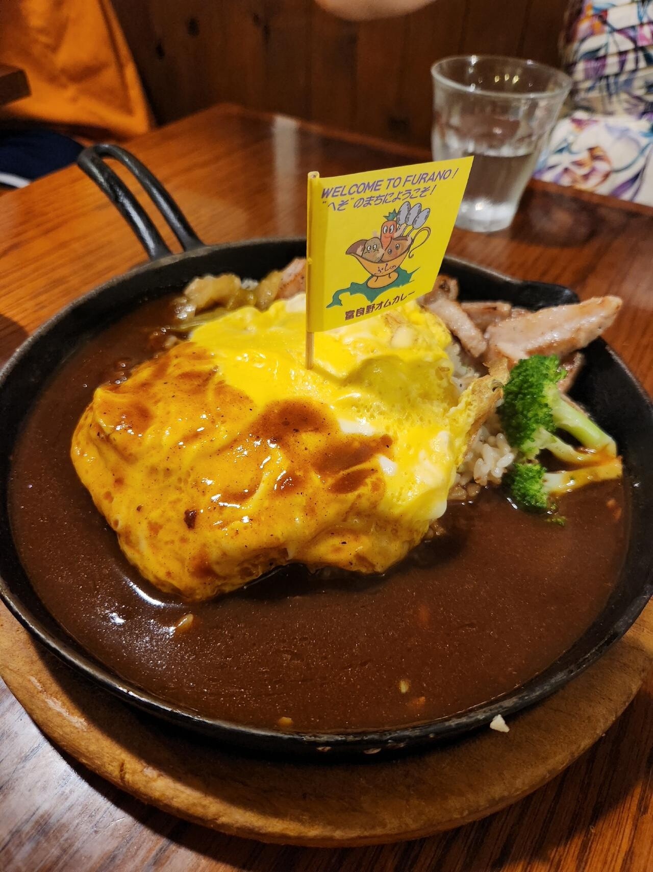 出城的第一站是富良野,从札幌开车大约两个半小时。到了富良野正是午饭时间,我们先按照小红书的推荐去了据说是富良野最好吃的汤咖哩店:Curry Shop Furanoya。果然火爆异常,一众食客在雨中大排长龙。我们不想等太久,就又找了一家谷歌评分不错的餐厅 (CURRY & BAR JAM)。这家店白天卖饭,晚上卖酒。内部的装饰充满了美国pop culture的元素,开在日本的乡下,别有趣味。