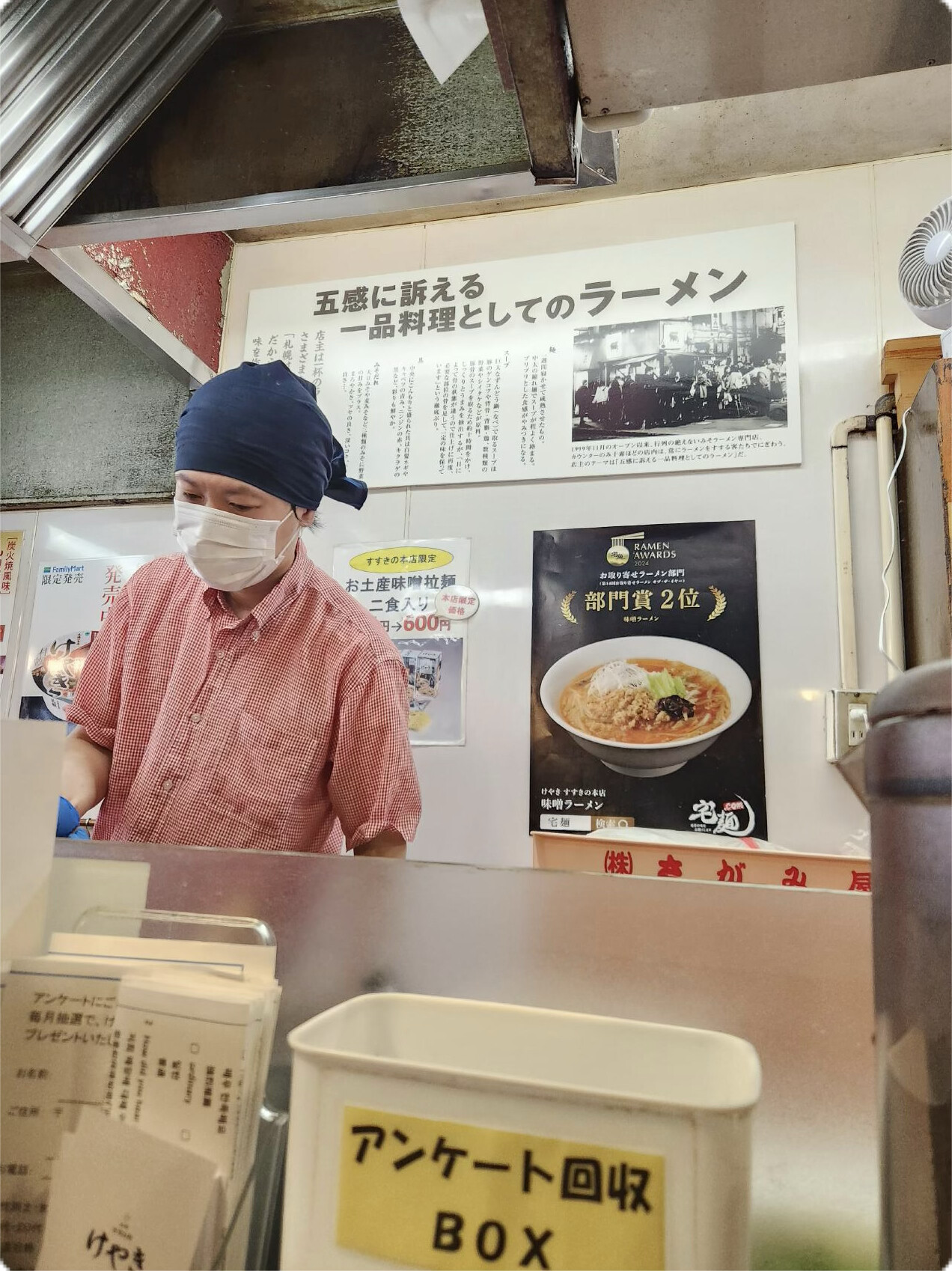 吃完了甜早餐,还必须接一顿咸早餐才行。我们下一站去了一家店面很小但颇有人气的拉面店。 这是一家典型的日式小店,座位围在厨师的操作台前,桌子只有窄窄的一条,客人都挤在一起也只能容纳九人同时吃面。虽然是早午不接的时间,店外仍有客人排队。我们点了一碗叉烧味增拉面。