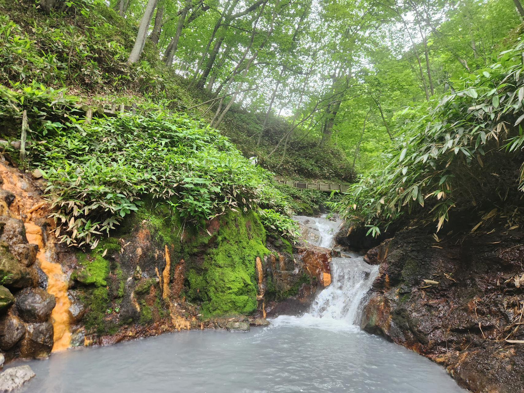 白须瀑布离青池很近。与普通的河流断层瀑布不同,白须瀑布属于罕见的潜流瀑。它的水源来自十胜岳群峰的地下水。这些水在地下流动,遇到断崖时,从岩石缝隙中喷涌而出。水流顺着岩壁垂下,分成无数细小的水柱,看起来就像老人的白色胡须,因此得名“白须瀑布”。