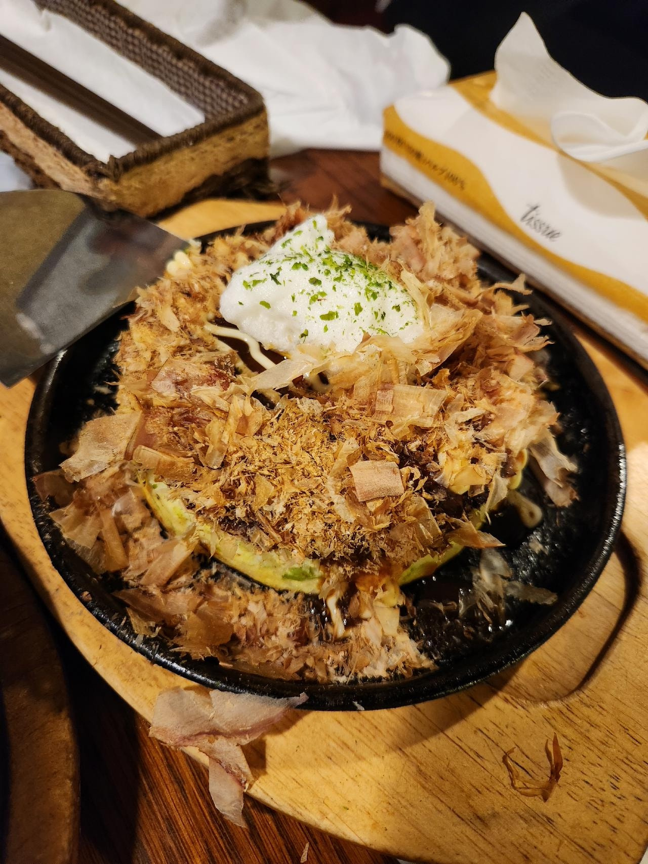 民宿提供晚餐,但是需要提前预定。我们之前没有预定,于是开车去城里觅食。根据谷歌地图的评价随便找了一家以大阪烧闻名的店。店里人很多坐得满满当当,加上厨房是开放式的铁板烧灶台,整个空间热气腾腾。我们点了招牌的大阪烧和咖喱蛋包饭,味道很一般。
