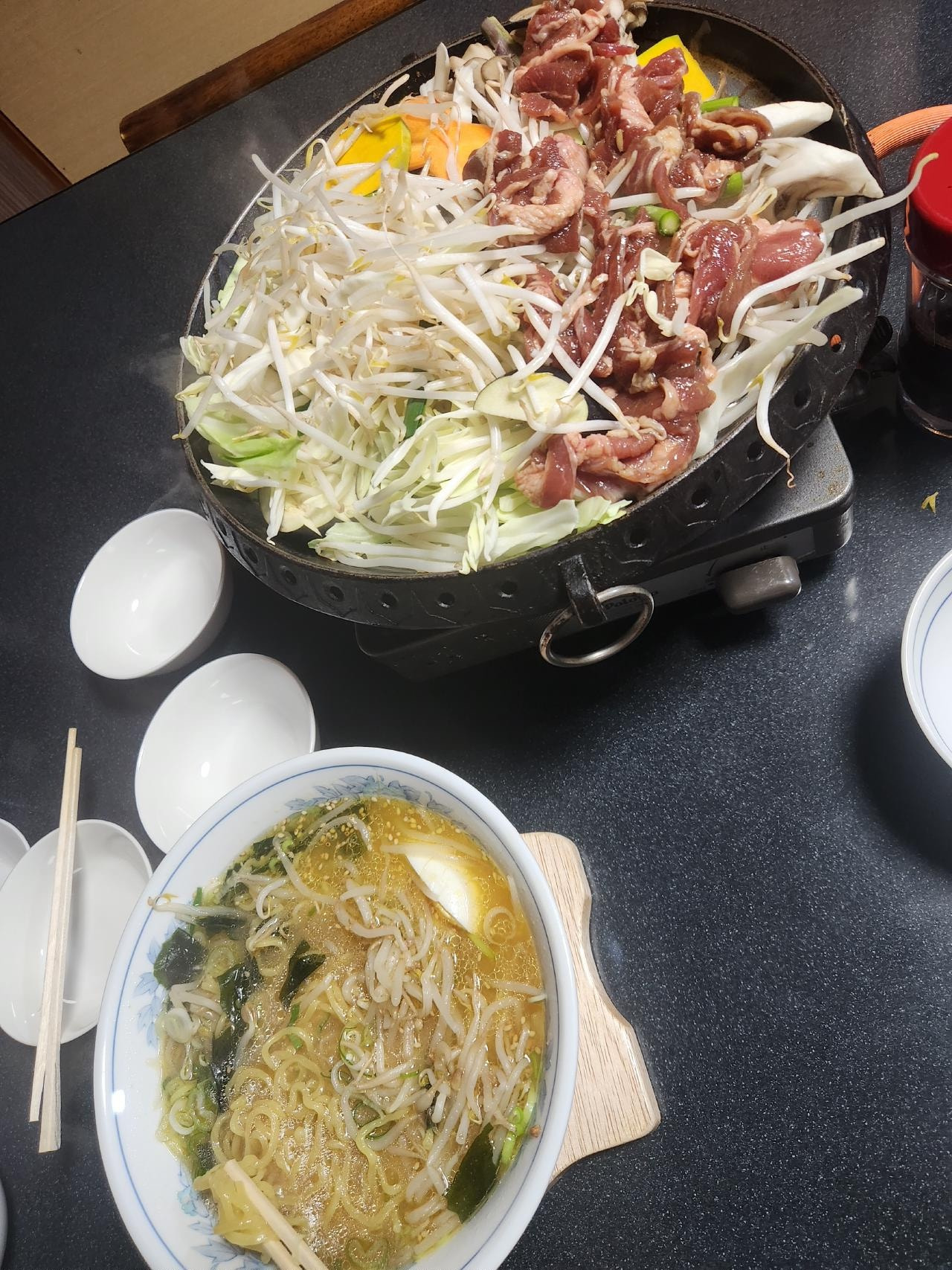 从民俗村出来,我们到登别城中吃晚饭。我们选了一家当地很受欢迎的小店吃成吉思汗烤肉。成吉思汗烤肉是北海道的特色美食。在日本其他地方,人们更习惯吃牛肉或猪肉,但在北海道,羊肉最受偏爱。
