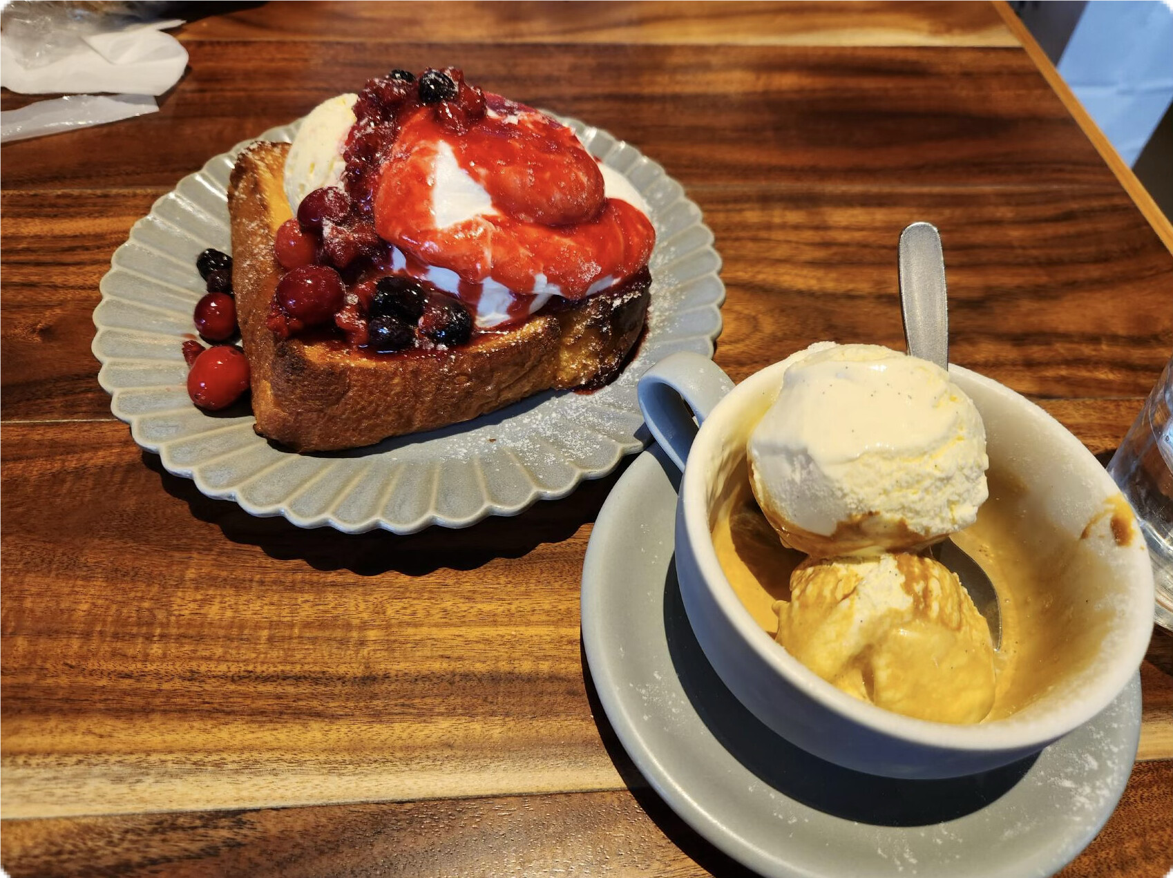 店是偏西式现代的风格,店里的客人也有不少外国游客。我们到店的时候已经过了brunch time,只能从dessert和drink menu点。我们点了招牌的mixed berry French toast,冰激淋咖啡,和一个外带的 earl gray orange 100 bread。