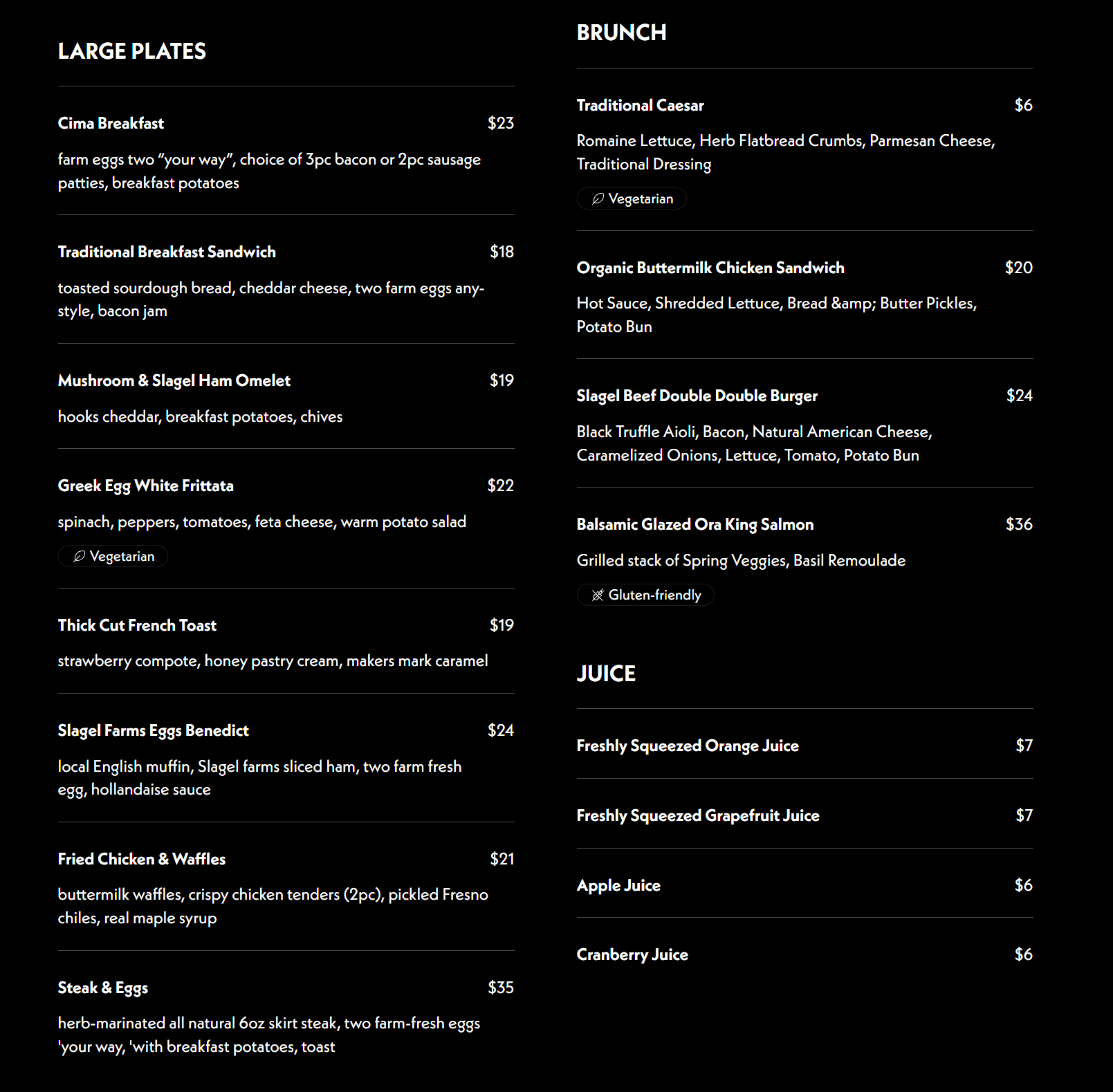 于是又去了一晚,第二天看菜单的时候发现没有brunch选项,也就是没有grilled salmon。但steak确实是有的,和LD点了两份,和两杯鲜榨橙汁(真鲜榨,比所有地方的都好喝)。
