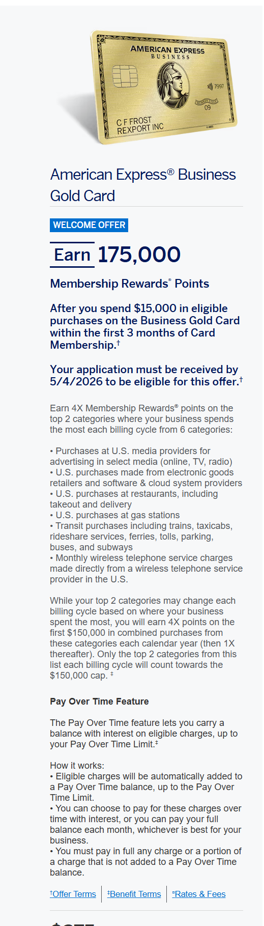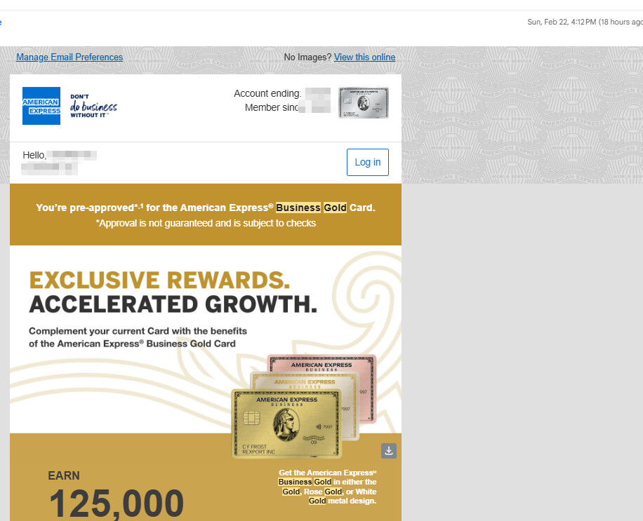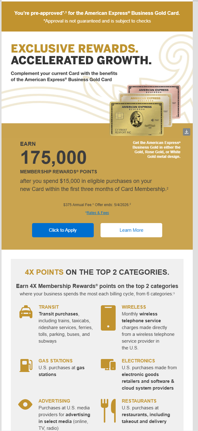 you’re invited to earn 175,000 Membership Rewards® points with the Business Gold Card 这是Email Subject