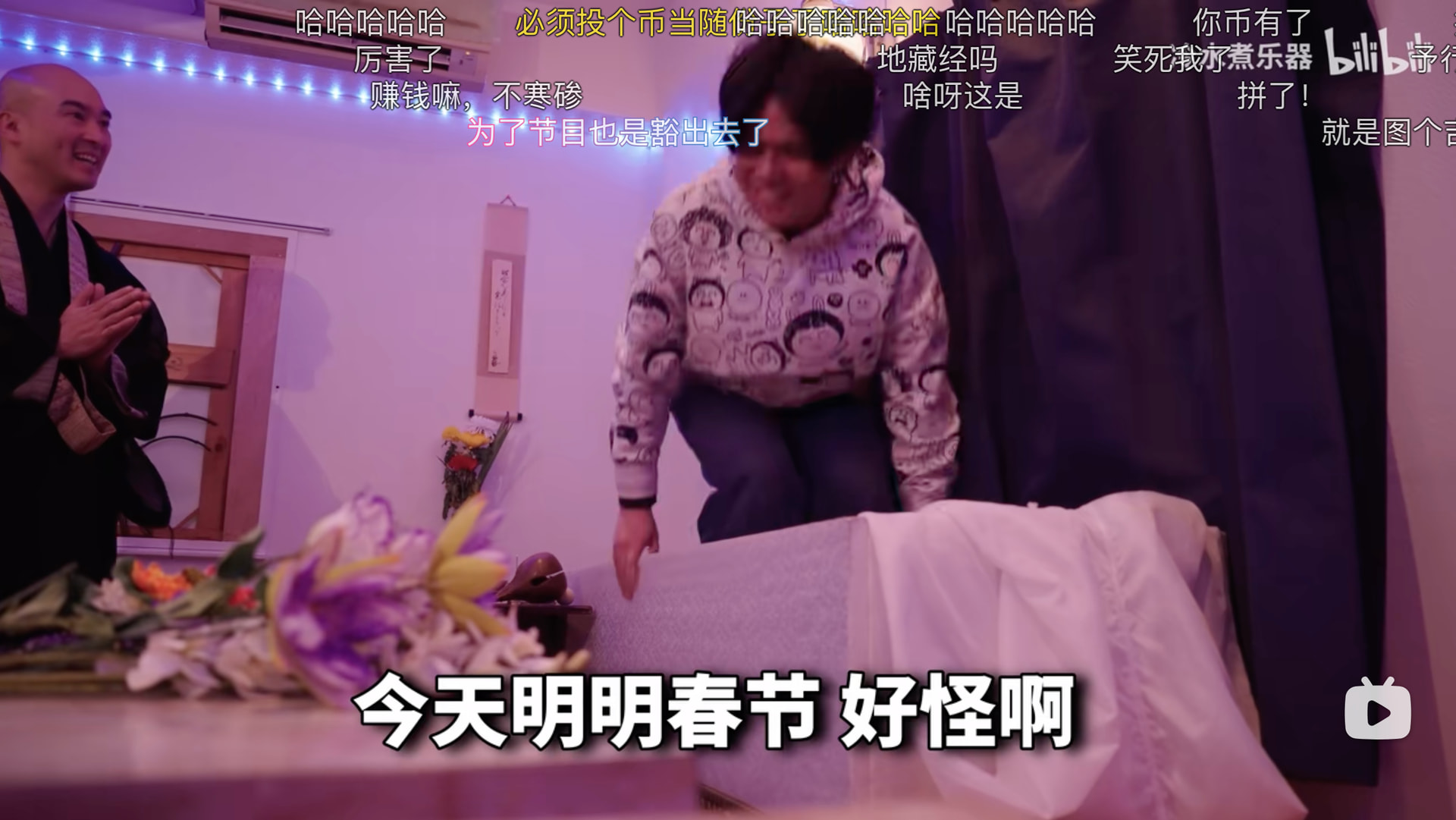 视频的高潮莫过于博主亲身体验了酒吧的 “入棺”仪式。在和尚的指引下,博主躺进棺材并盖上盖子,体验模拟死亡的过程。这种在酒吧里完成的“超度”,旨在让人在清醒时思考生命的价值,体验过后确实会有一种豁然开朗的感觉。