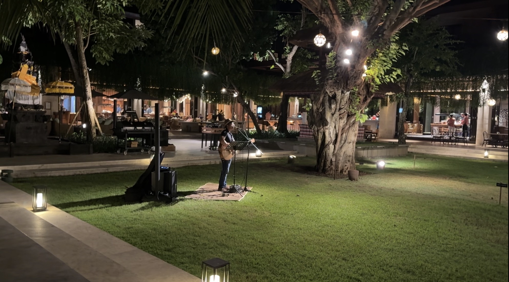 酒店几家餐厅都在一起。中庭有一个草坪。有时候晚上会请乐队表演。有时候会是专门的烧烤活动这类的。几分都是户外通风的。我是真觉得蚊子太多了。没在酒店吃过晚餐。