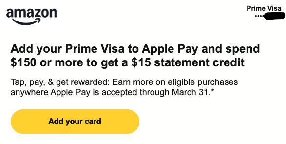 Chase Amazon Prime Visa Card添加到Apple Pay, 消费$150返$15