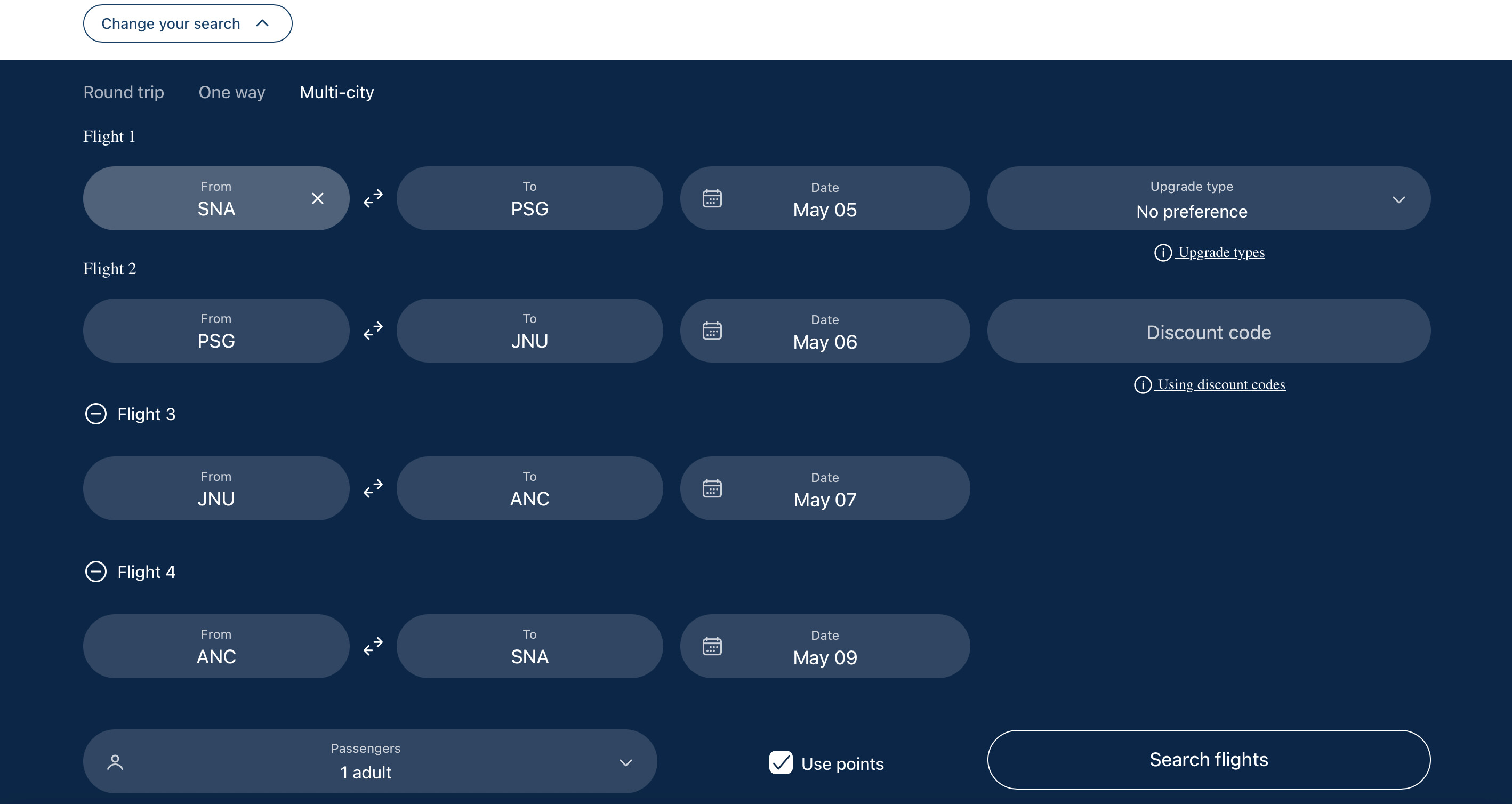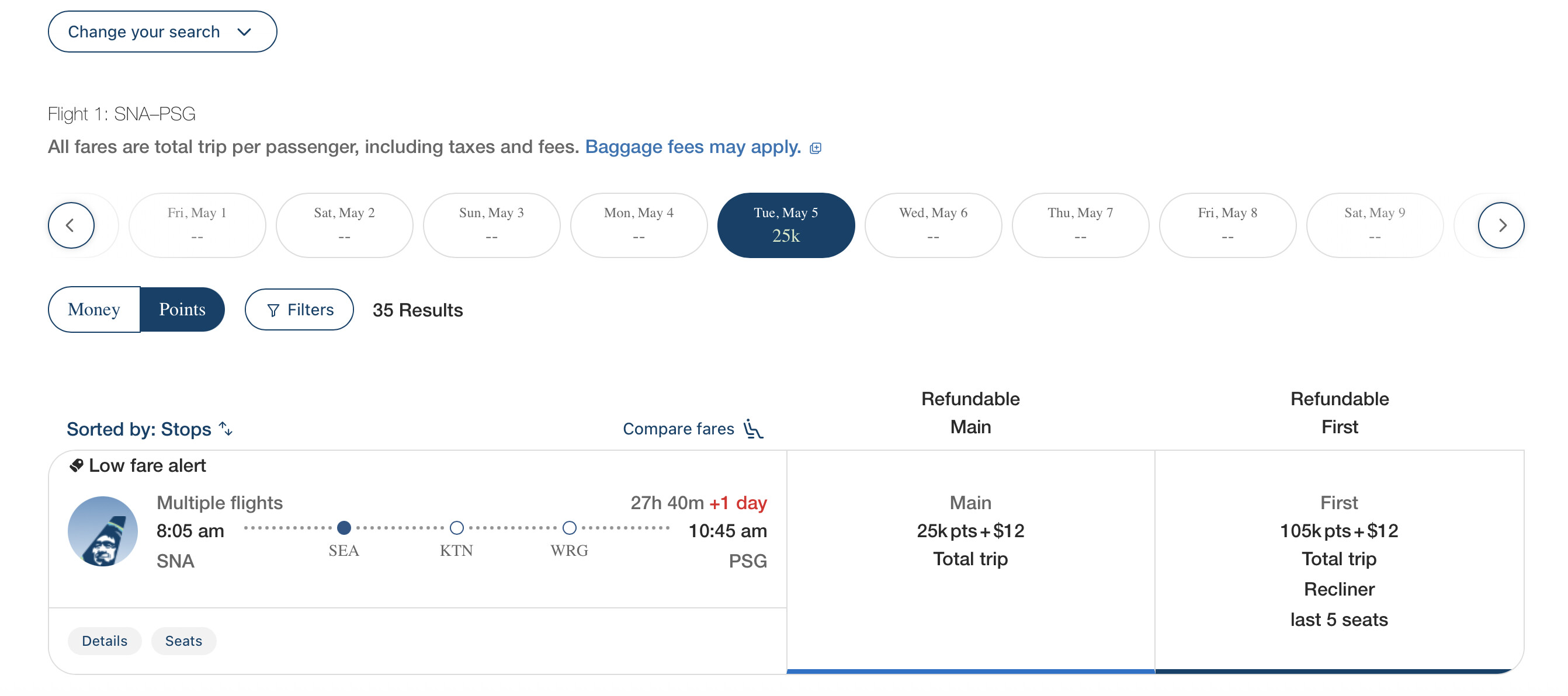 就冒出来了五月和P2去Milk Run顺便用掉这个基友票的念头。参考帖子里谭友分享的路线,再加上自己摸索了一番,敲定了一个四天的short trip:周五晚从南加出发,在SEA停留一晚后周六到JNU,JNU再停留一晚后到ANC,在ANC呆两晚后返回。搜票的时候四个segments分别是LA-PSG,PSG-JNU,JNU-ANC,ANC-LA,其中PSG并不停留, 但这样搜比较容易搜出包含牛奶线的行程。